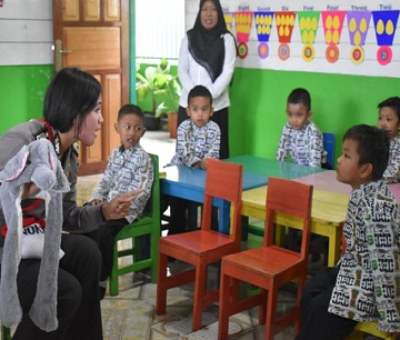 Bripkan Irma dalam kegiatan ini berbagi cerita dongeng sambil bernyanyi dan berkenalan dengan para murid TK.