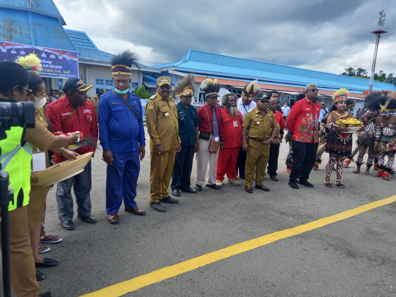John Wempi Wetipo, tiba di Bandara Nabire pada hari Senin siang, dan disambut dengan tarian adat serta rombongan Bupati dari wilayah Meepago.