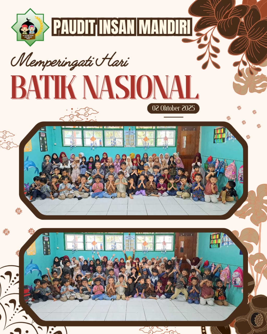 Nabire, 2 Oktober 2025 – Suasana meriah terlihat di PAUDIT Insan Mandiri Nabire dalam rangka memperingati Hari Batik Nasional 2025. Seluruh peserta didik, guru, serta staf sekolah kompak mengenakan seragam batik sebagai bentuk cinta budaya sekaligus kebanggaan terhadap warisan bangsa Indonesia.