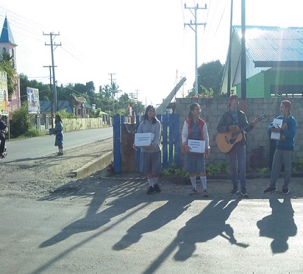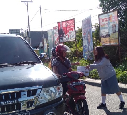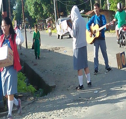 Mereka dengan sukacita melakukan penggalangan dana dengan membawa kardus yang bertuliskan “Peduli Korban Banjir Sentani”.