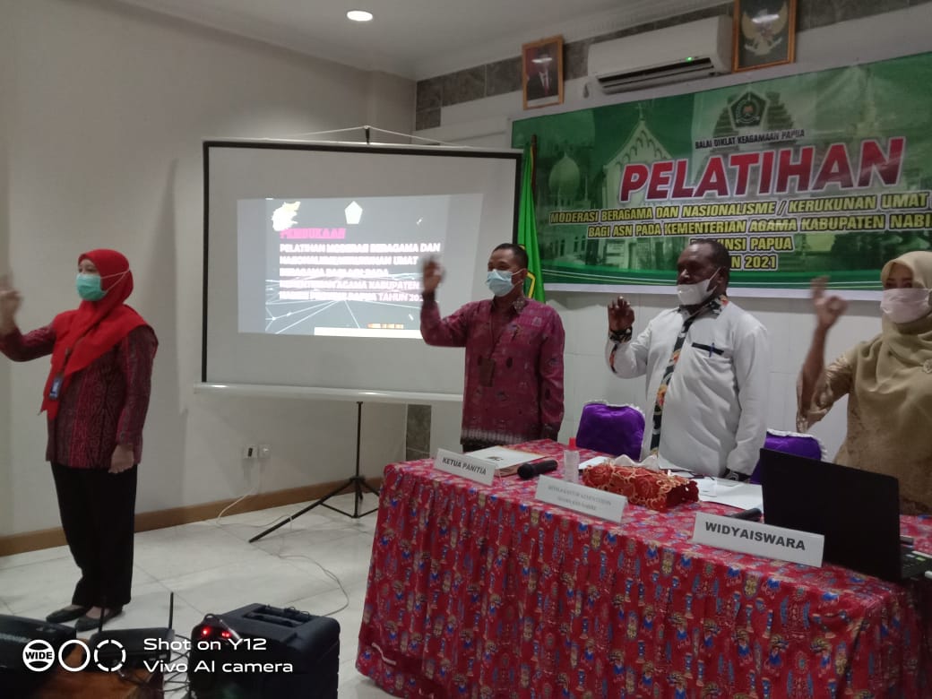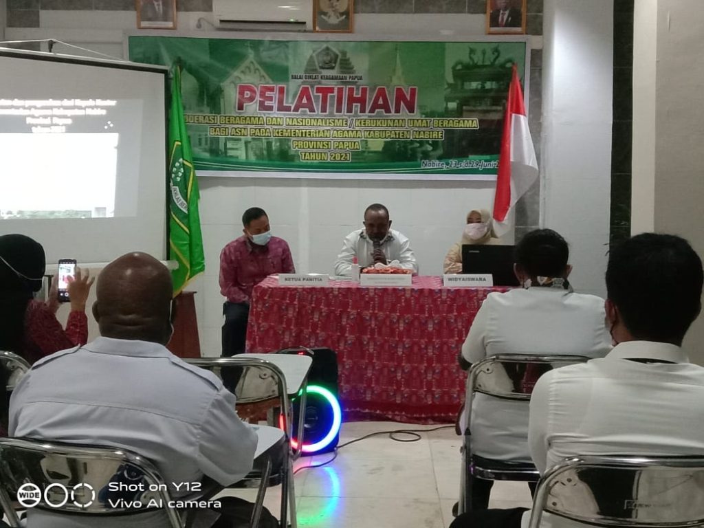 Nabire, Balai Diklat Keagamaan Papua bekerjasama dengan Kantor Kementerian Agama Kabupaten Nabire melaksanakan pelatihan Moderasi Beragama dan Nasionalisme/Kerukunan Umat Beragama bagi ASN pada Kantor Kementerian Agama Kabupaten Nabire Provinsi Papua tahun 2021.