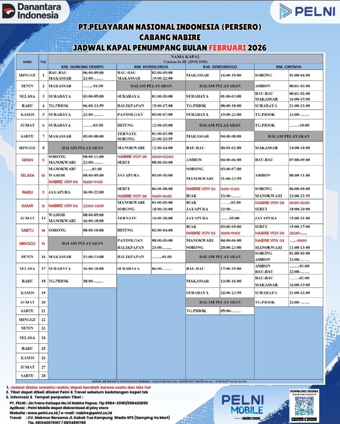 Nabire, 30 Januari 2026 – Empat kapal PELNI akan melayani pelayaran ke Nabire selama bulan Februari 2026. Keempat kapal tersebut disiagakan untuk mengantisipasi lonjakan penumpang menghadapi bulan Ramadan dan Idul Fitri 2026.