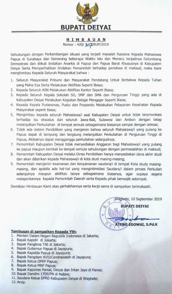 Hal senada juga disampaikan Bupati Deiyai, Ateng Edowai, S.Pd.K dalam surat himbauan nomor 420/307/BUP/2019, tanggal 10 September 2019.