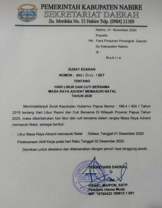 Hal itu tertuang dalam Surat Edaran Sekda Nabire Nomor 003/3046/SET tentang Hari Libur & Cuti Bersama Masa Raya Advent Memasuki Natal Tahun 2020.