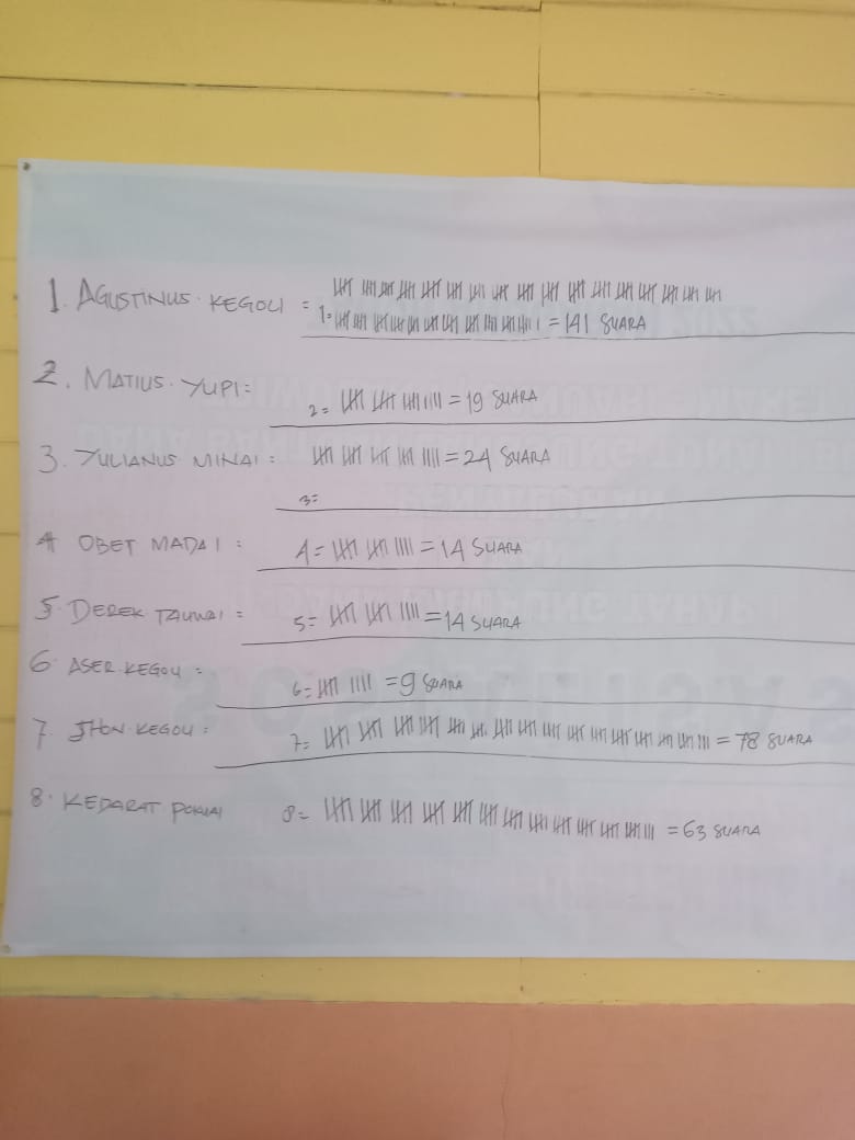 Proses pencoblosan sendiri telah selesai dan calon Kepala Kampung yang meraih suara terbanyak atas nama Agustinus Kegou dengan raihan suara sebanyak 141 suara, mengungguli calon nomor urut 7 Jhon Kegou yang meraih 73 suara.