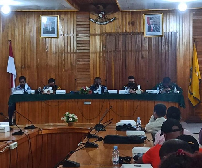 Rapat tersebut dilaksanakan hari kamis siang (23/09/21), bertempat di Aula Setda Nabire, dihadiri oleh unsur Forkopimda, para Tokoh Adat, Tokoh Masyarakat, Tokoh Agama, Kepala-Kepala Suku, serta Timses Paslon 01, 02 dan 03.