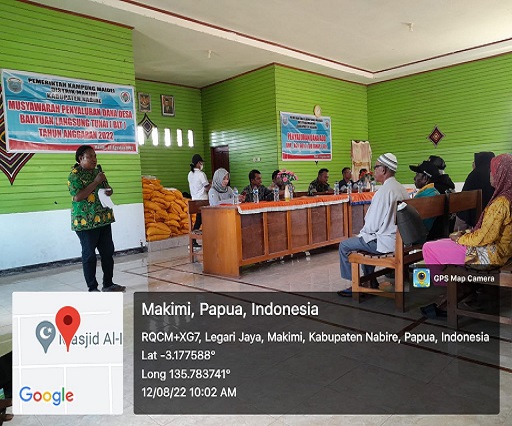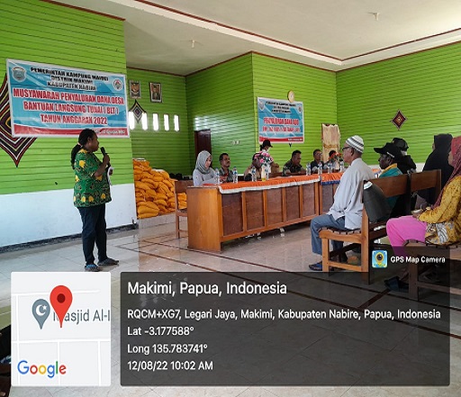 Nabire, Jumat, 12 Agustus 2022, bertempat di Kantor Kampung Maidei, Distrik Makimi, kabupaten Nabire, telah dilaksanakan penyerahan Bantuan Langsung Tunai (BLT) sumber Dana Kampung (DK) Triwulan 1, periode bulan Januari sampai Maret tahun 2022.