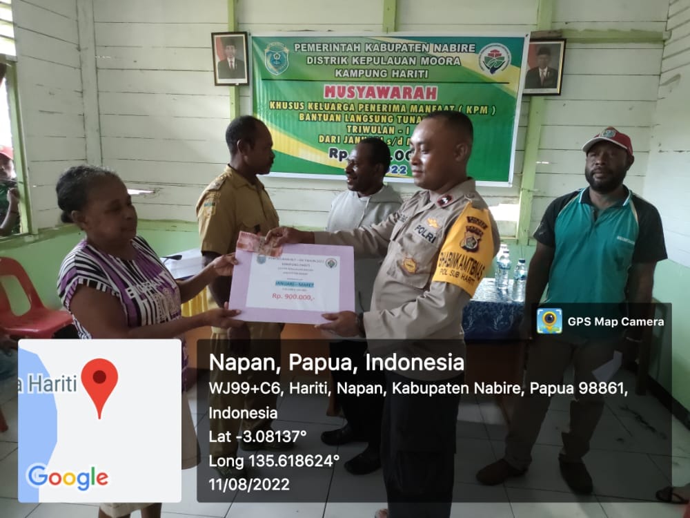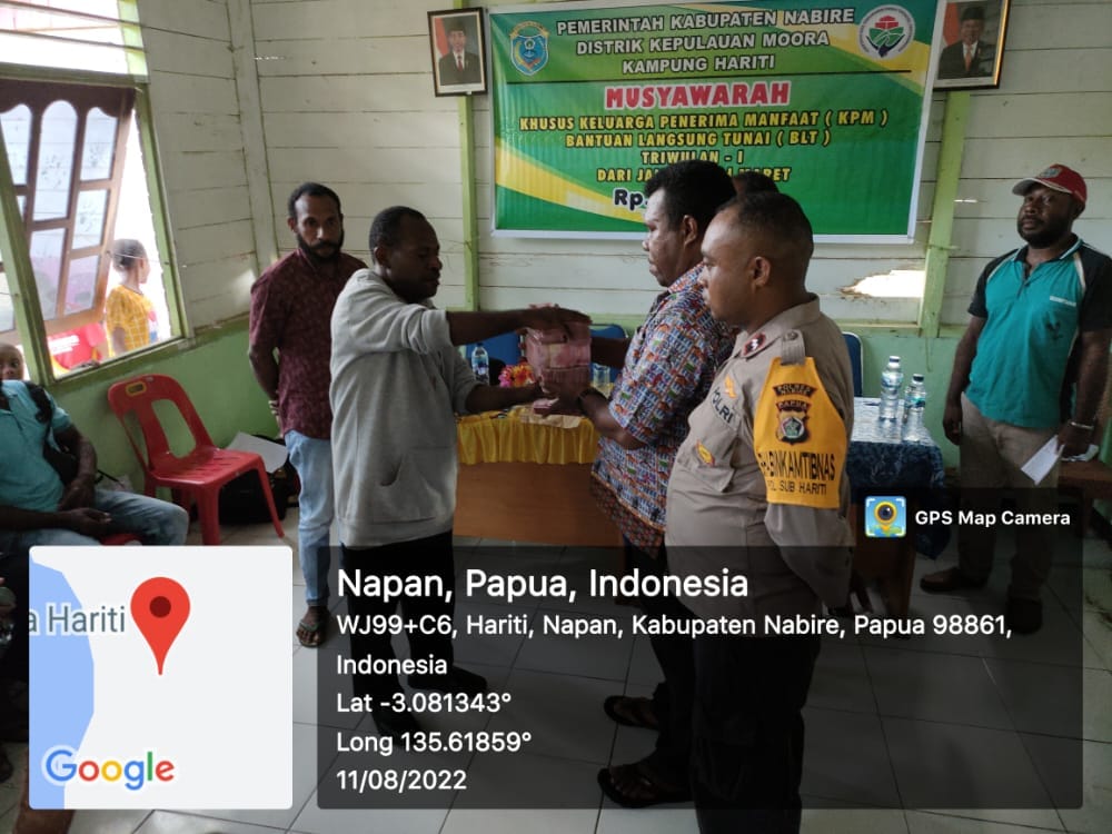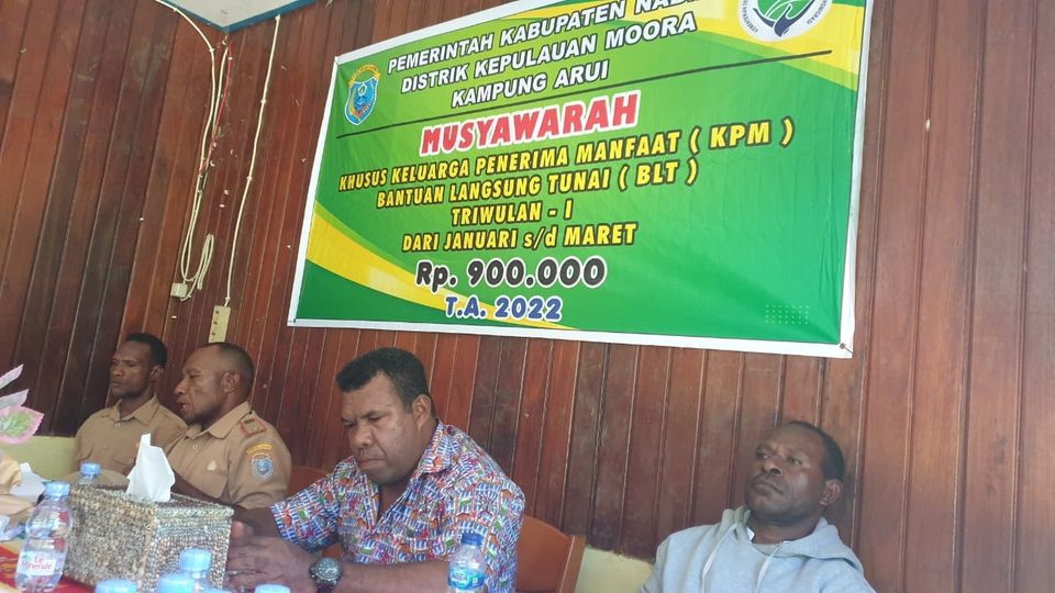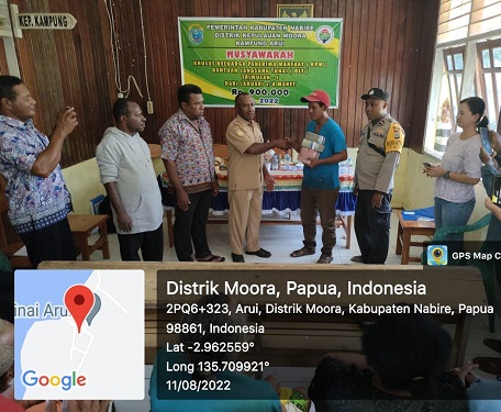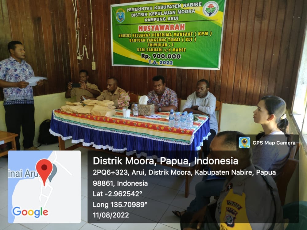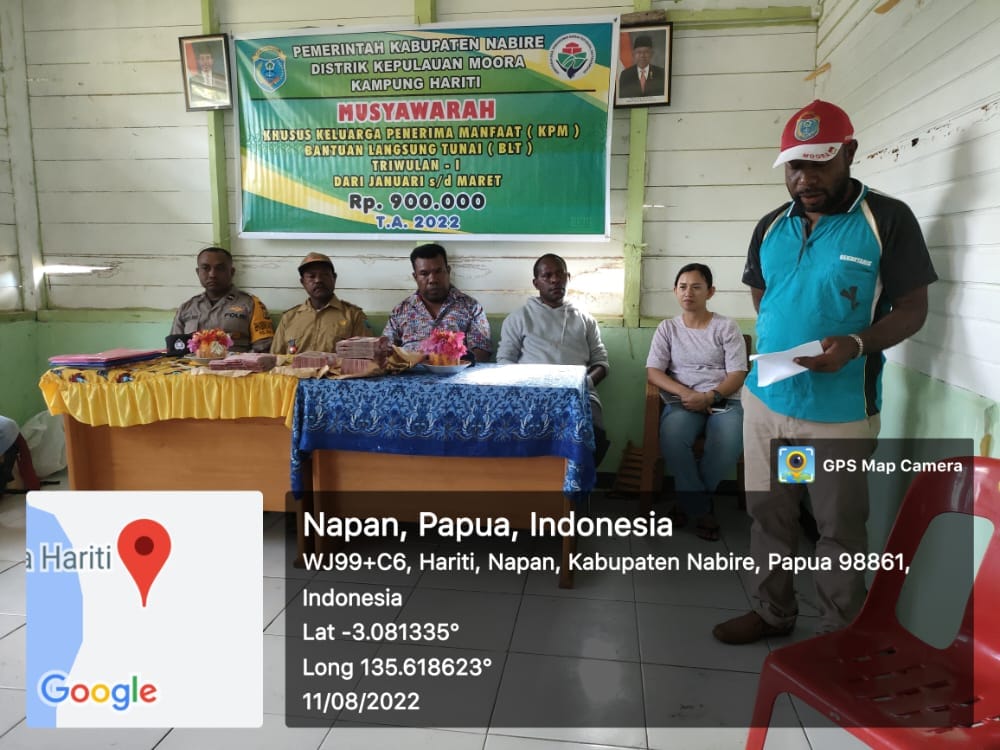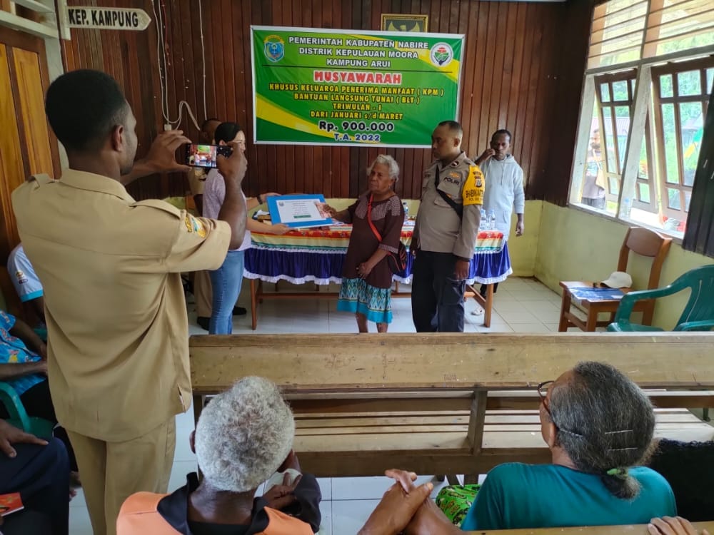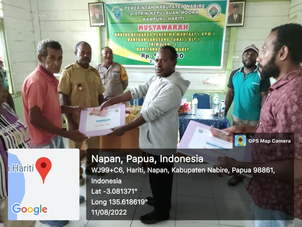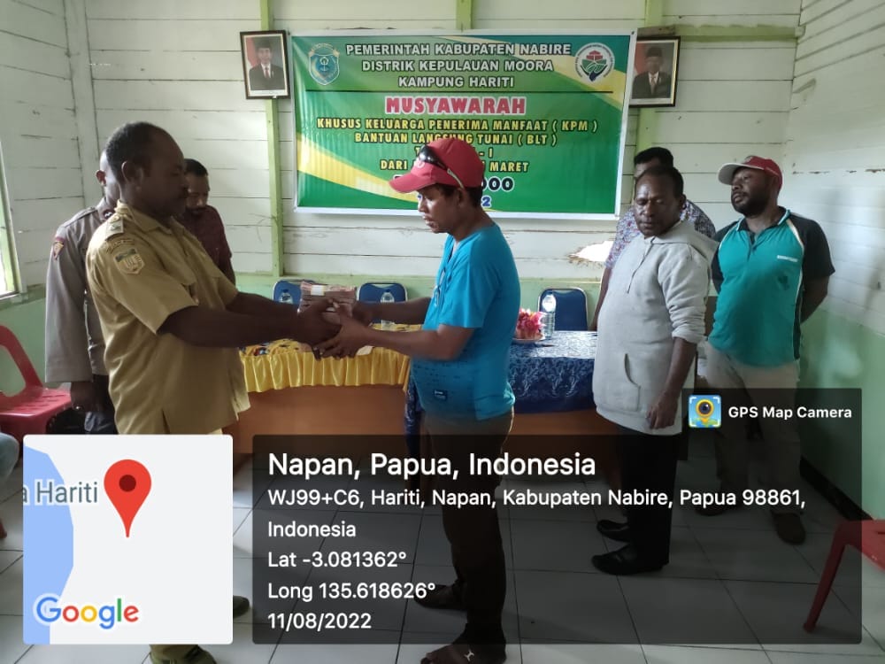 Nabire, Bertempat di Kampung Arui dan Kampung Hariti, Distrik Kepulauan Moora, kabupaten Nabire, telah dilaksanakan penyerahan Bantuan Langsung Tunai (BLT) dengan sumber dana berasal dari dana kampung Triwulan I untuk bulan Januari – Maret 2022.