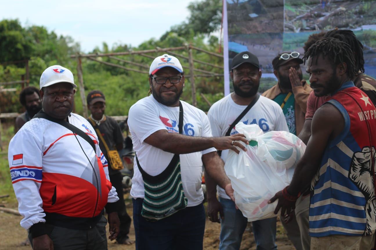 Ketua DPW PERINDO Papua Tengah, Pilemon Keiya, didampingi Wakil Ketua II Anto Sonny Pakage dan Ketua DPD PERINDO Kabupaten Deiyai Demianus Agapa, hadir langsung menyalurkan bantuan di lokasi kegiatan, Kaladiri II, Nabire Barat pada Sabtu siang, 26 Juli 2025.