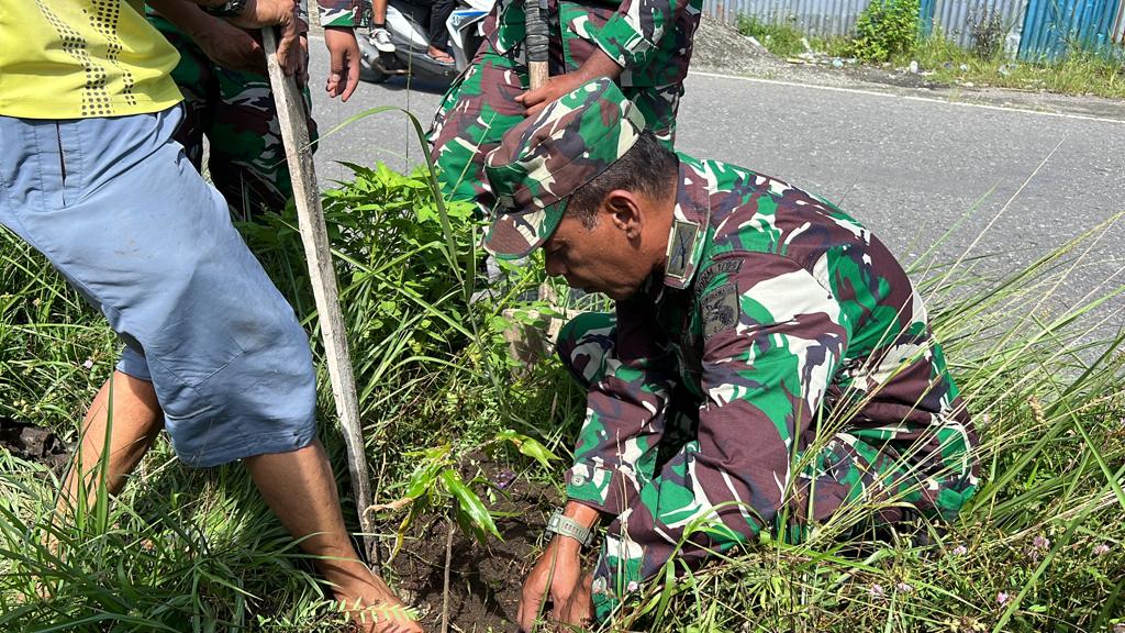 Nabire, Dalam rangka memperingati Hari Juang TNI-AD ke-78 Tahun 2023, Kodim 1705/Nabire melaksanakan kegiatan penghijauan yaitu penanaman bibit pohon di sepanjang jalan poros Nabire Kabupaten Nabire, Provinsi Papua Tengah, Kamis (14/12/2023).