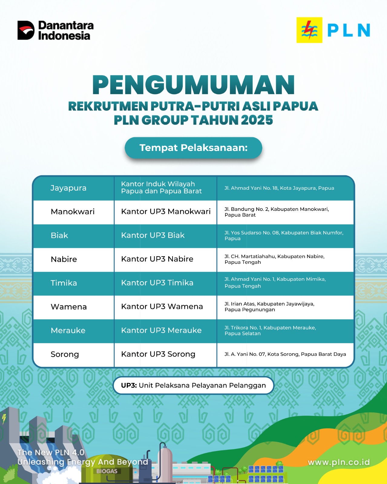 Bagi pelamar asal Nabire, seleksi akan dilaksanakan di Kantor UP3 Nabire, Jl. CH. Martha Tiahahu, Kabupaten Nabire, Papua Tengah.