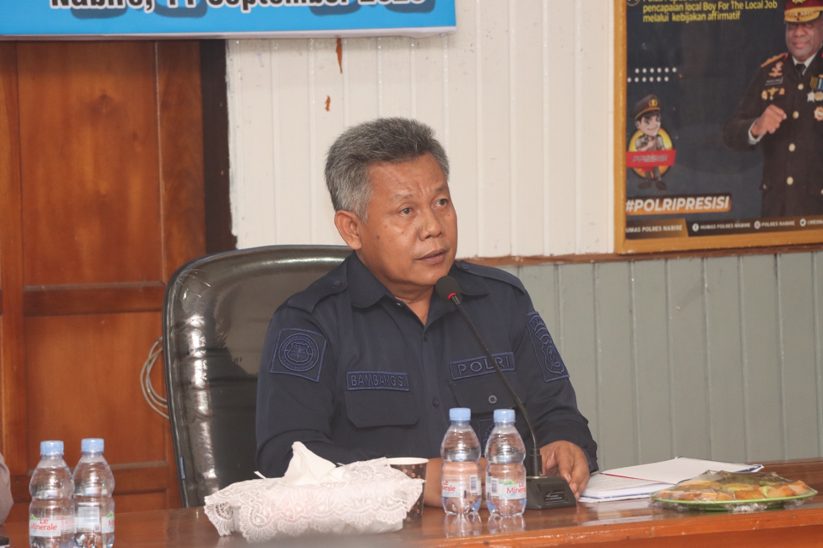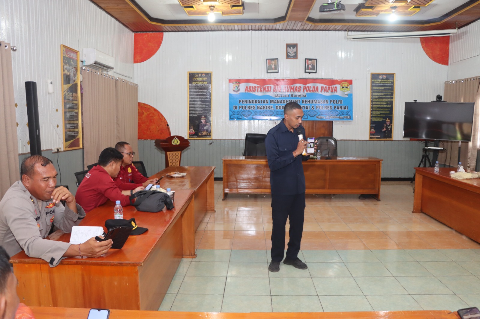 Wakapolres Nabire, Kompol I Wayan Laba, SH, MH mewakili Kapolres Nabire pada saat membuka acara Asistensi menyampaikan Terima kasih kepada team Asistensi dari Bid Humas Polda Papua yang dipimpin oleh Kasubbid Penmas Kompol Bambang Suranggono, S.Sos bersama 3 anggota 1 personil berpangkat pama, dan 2 personil bintara.
