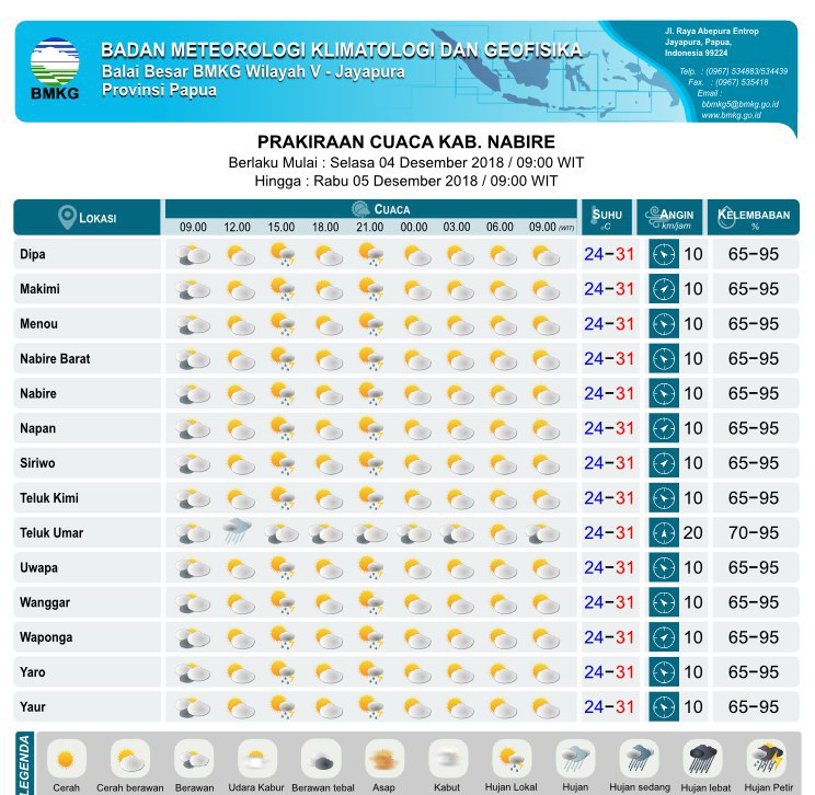 Nabire – Berikut Prakiraan Cuaca kabupaten Nabire, untuk hari Selasa, 4 Desember 20188, berlaku mulai pukul 07.00 pagi wit, yang berasal dari Badan Metereologi, Klimatologi & Geofisika (BMKG) kabupaten Nabire.