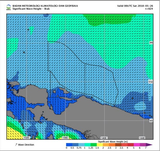 Berikut Prakiraan Cuaca Pelayaran & Tinggi Gelombang Perairan Papua & Papua Barat, Sabtu, 26 Mei 2018, berlaku 24 Jam, mulai pukul 09.00 wit.