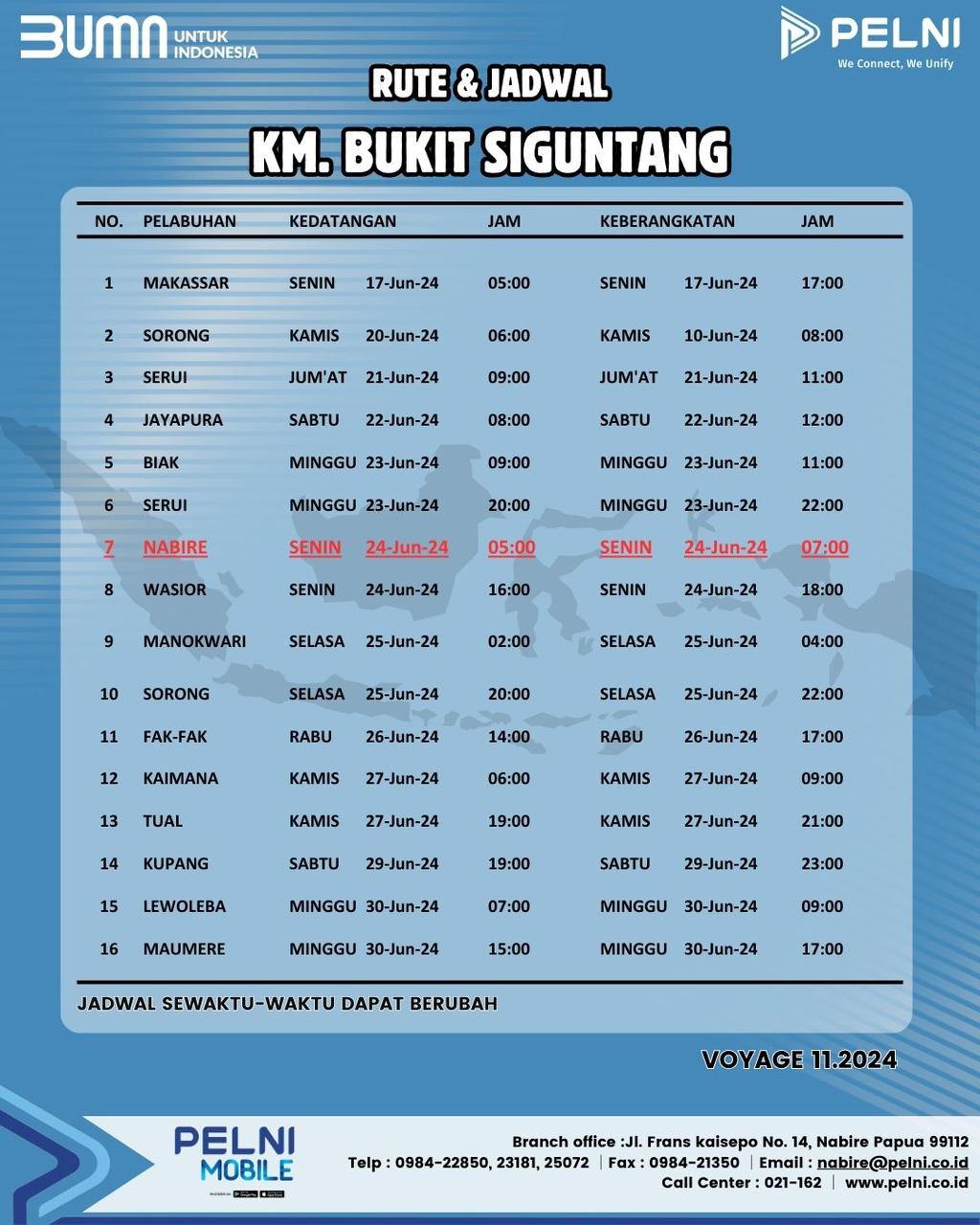 Berikut jadwal kapal KM Bukit Siguntang yang akan melayani pelabuhan Samabusa Nabire :