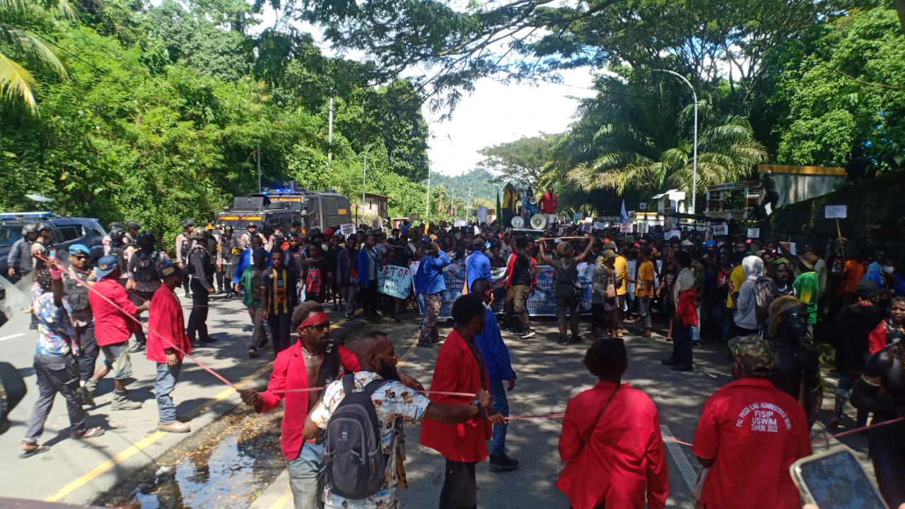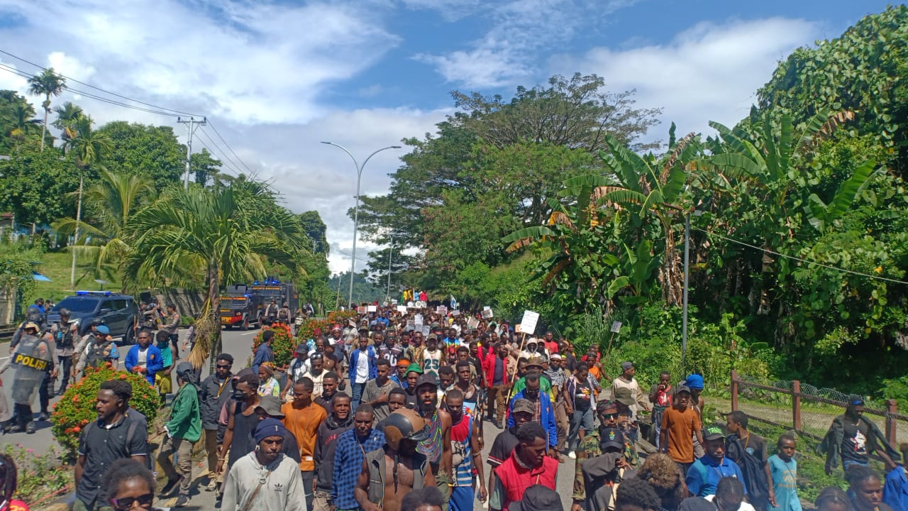 Ratusan massa melakukan long march dari Karang Tumaritis menyusuri Bukit Meriam dan hendak menuju bandara lama Nabire lokasi Kantor Gubernur Papua Tengah. Pergerakan massa dikawal oleh pihak kepolisian.