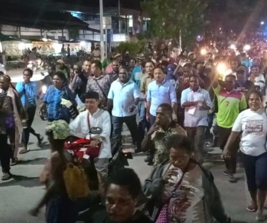 Pantauan langsung Nabire.Net menunjukkan antusiasme luar biasa dari pendukung Martinus – Agus yang sejak awal berkumpul di Kantor RRI Nabire untuk menyaksikan debat publik ketiga. Setelah acara debat berakhir sekitar pukul 19.45 WIT, massa mulai bergerak menyusuri Jalan Merdeka menuju Tugu Cendrawasih Oyehe, kemudian melalui Jalan Yos Sudarso hingga ke Lampu Merah Jalan Sisingamangaraja Pantai Nabire, dan berakhir di posko kemenangan yang terletak di Morgo, kediaman Bapak Tabuni.