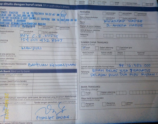 Bantuan dana tersebut sudah ditransfer oleh Kwarcab Nabire ke Jayapura, dan selanjutnya akan disalurkan ke warga terdampak bencana banjir bandang di Sentani.