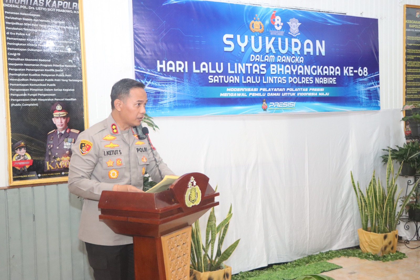Nabire, Satuan Lalu Lintas Polres Nabire menggelar syukuran Hari Lalu Lintas Bhayangkara ke-68. Kegiatan tersebut digelar di ruang RBP Polres Nabire, pada Senin (25/09) dengan mengangkat tema “Modernisasi Pelayanan Polantas Presisi Mengawal Pemilu Damai Untuk Indonesia Maju”.