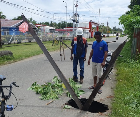 Mengetahui hal itu, Kapolsek Nabire Kota, AKP Agus Suprayitno, S.Sos, memerintahkan anggota Polsek Nabire Kota untuk memberi tanda palang sementara untuk menghindarkan warga dari kecelakaan.