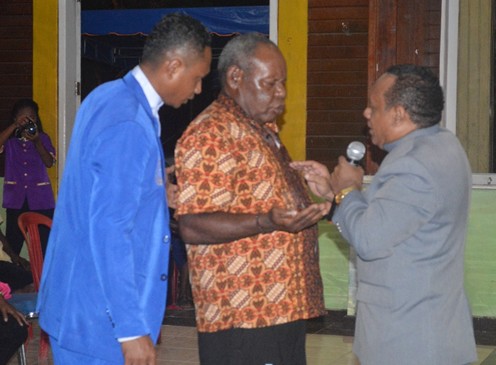 (Ps David Eston saat memberikan demonstrasi mujizat air kehidupan kepada umat Tuhan di Nabire yang mengalami penyakit asma yang langsung menjadi sembuh di dampingi Gembala Sion Ministry Nabire Pdt.Melkisedek S.Th)