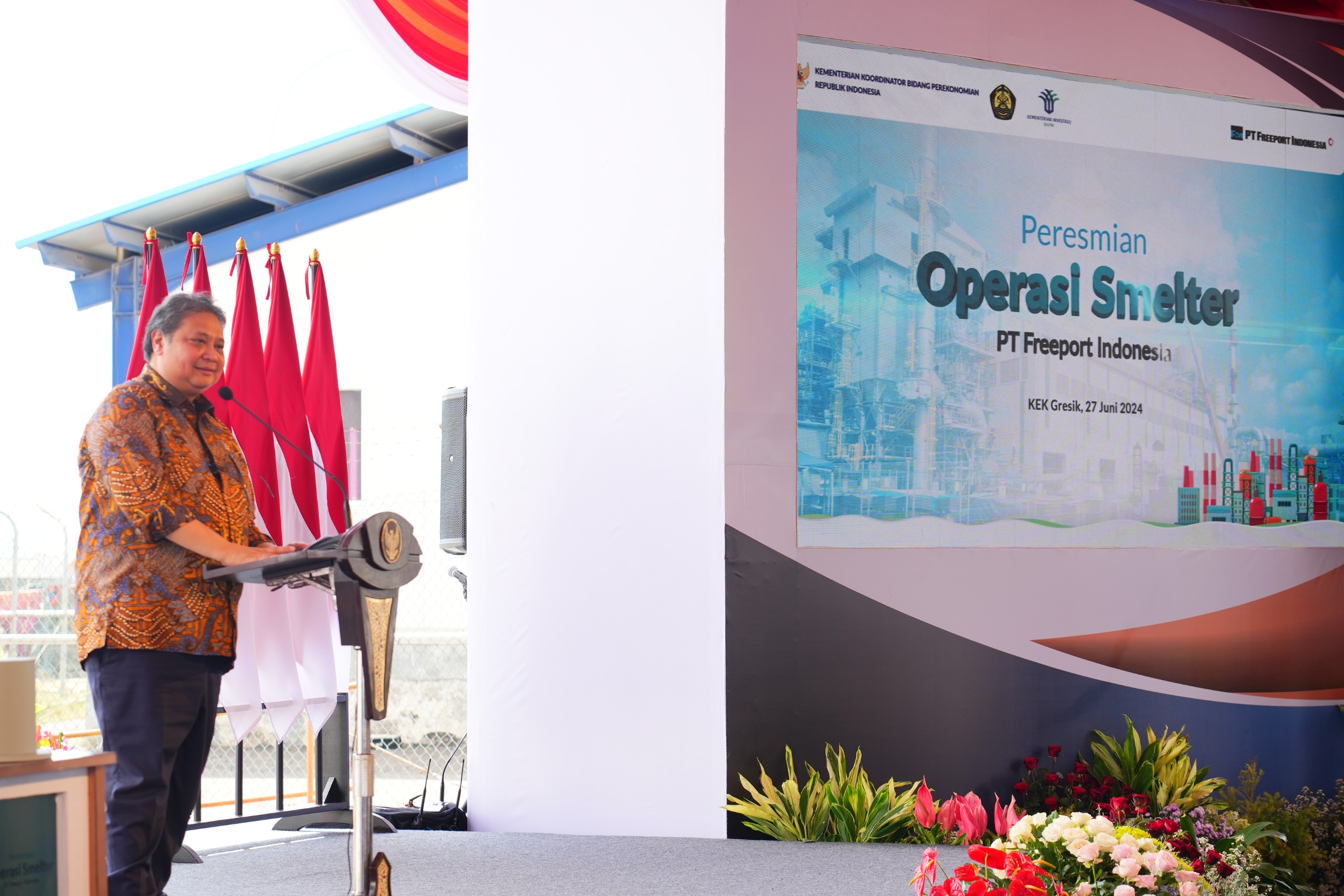 Gresik, Jawa Timur, 27 Juni 2024 – Menteri Koordinator Bidang Perekonomian Airlangga Hartarto bersama Menteri Investasi/Kepala Badan Koordinasi Penanaman Modal (BKPM) Bahlil Lahadalia, didampingi Presiden Direktur PT Freeport Indonesia (PTFI) Tony Wenas meresmikan beroperasinya smelter PTFI di Kawasan Ekonomi Khusus (KEK) Java Integrated Industrial and Port Estate (JIIPE), Gresik, Jawa Timur.