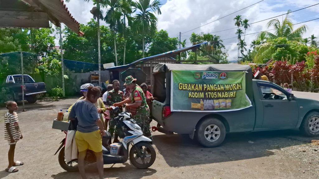 Nabire, 16 September 2025 – Dalam rangka menjaga stabilitas harga beras dan keterjangkauan bahan pokok bagi masyarakat, Babinsa Koramil 01/Nabire yaitu Sertu Zhet Buntu, Sertu Bambang, dan Praka Agus Bonay melaksanakan program Gerakan Pangan Murah (GPM) di Kelurahan Kalibobo, Distrik Nabire, Kabupaten Nabire, Selasa (16/09/2025).