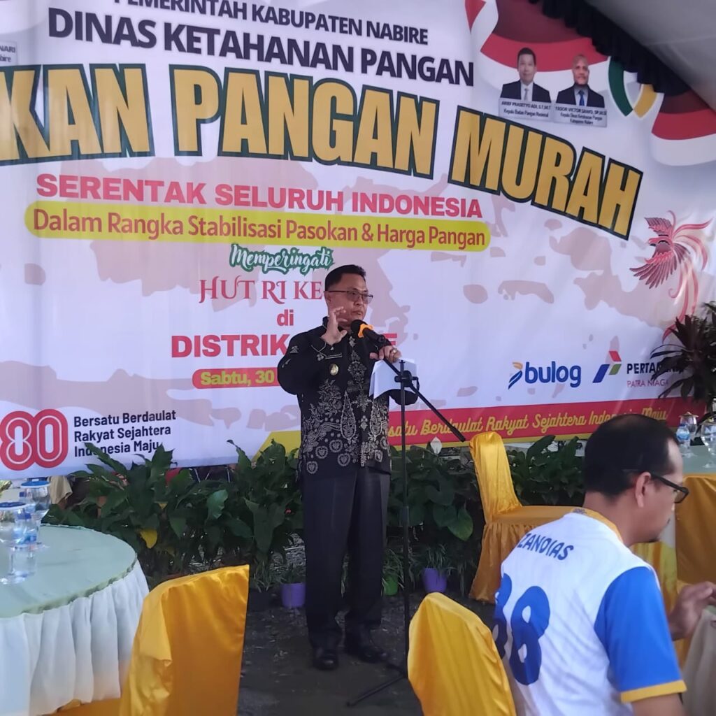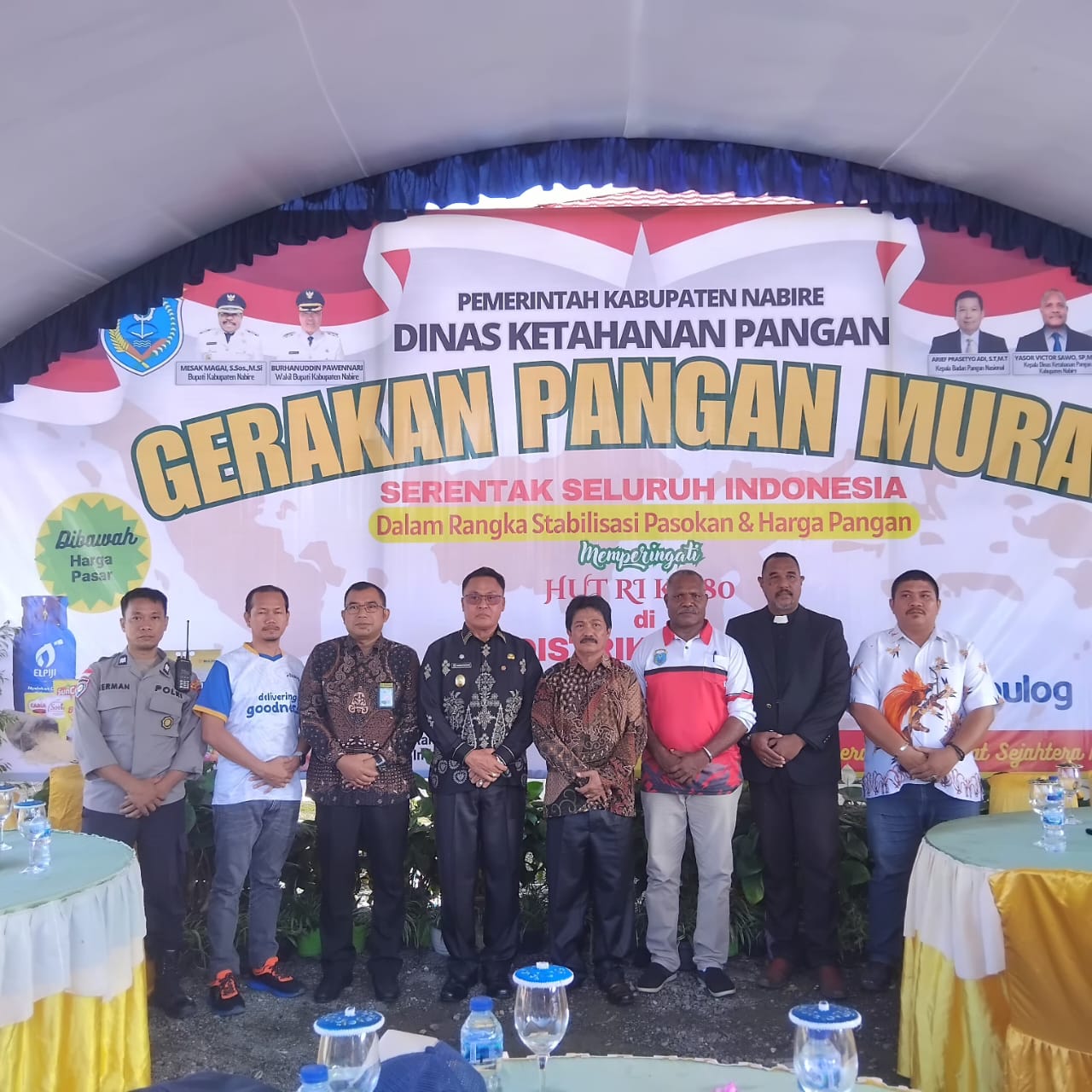 Nabire, 30 Agustus 2025 – Pemerintah Kabupaten Nabire melalui Dinas Ketahanan Pangan bersama Wakil Bupati Nabire menggelar Gerakan Pangan Murah (GPM) serentak seluruh Indonesia. Kegiatan ini berlangsung di Halaman Kantor Ketahanan Pangan Nabire, Sabtu (30/8/2025), dalam rangka menjaga stabilitas pasokan dan harga pangan, sekaligus memeriahkan HUT ke-80 Kemerdekaan Republik Indonesia.