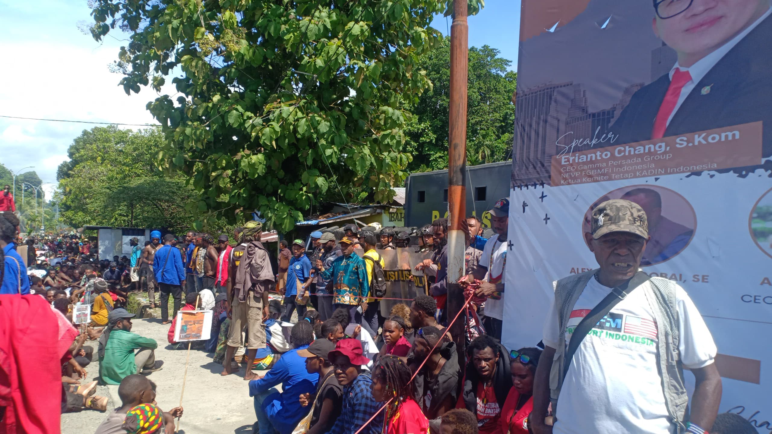 Saat ini massa masih duduk di depan jalan menuju pintu masuk bandara lama lokasi Kantor Gubernur Papua Tengah. Massa diketahui melakukan long march dari Karang Tumaritis.