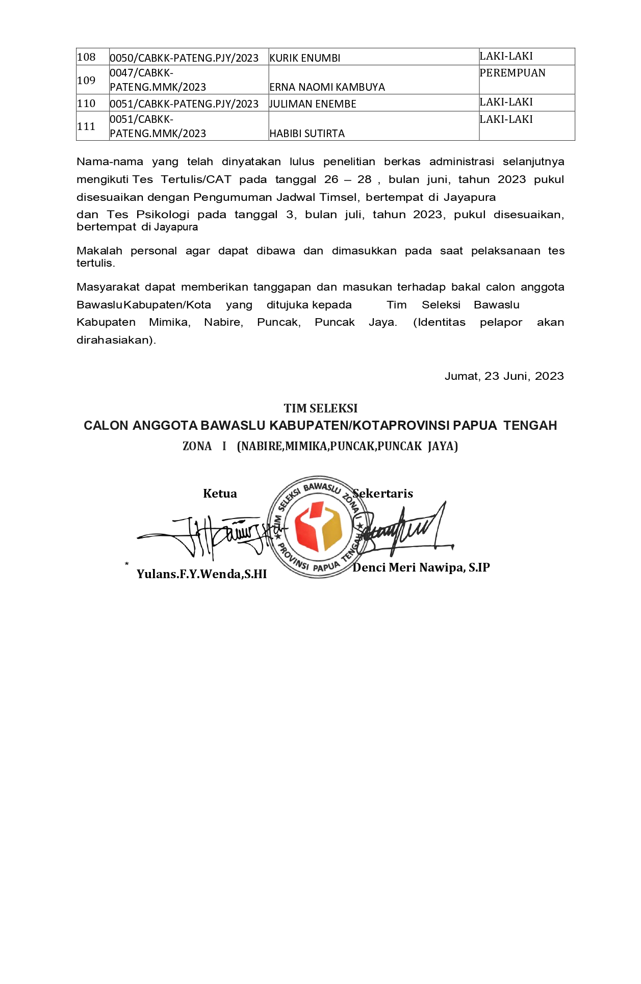 Hal tersebut sesuai dengan Pengumuman Tim Seleksi Calon Anggota Bawaslu Kabupaten Zona I (Nabire, Mimika, Puncak, Puncak Jaya), tentang hasil penelitian berkas administrasi Calon Anggota Bawaslu Zona I Kabupaten Nabire, Mimika, Puncak dan Puncak Jaya Nomor: 02/TimseI-Bws-Kab/ Papua Tengah/Zona I/VI/2023.
