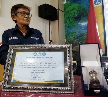 Penyerahan penghargaan kepada Ibu Artik Artini, S.IP, S.SES, S.IKom, M.Si., merupakan wujud penghargaan UT atas pengabdian dan dedikasi beliau sebagai Ketua Universitas Terbuka Kabupaten Nabire selama 35 tahun (1987 s.d 2022).