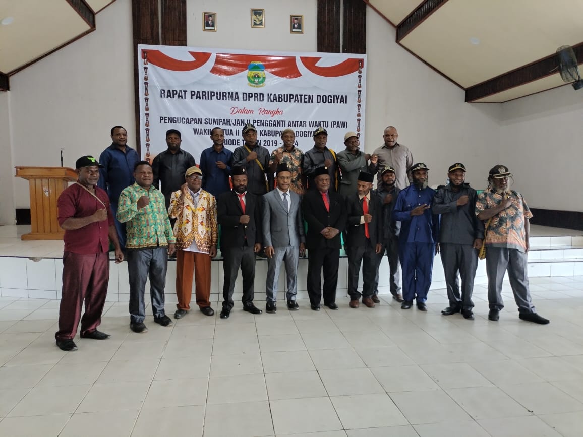 Pengucapan Sumpah/Janji Pengganti Antar Waktu (PAW) Wakil Ketua II DPRD Kabupaten Dogiyai periode Tahun 2019 – 2024 ini mengacu pada surat pengunduran diri Orgenes Kotouki tanggal 28 April 2023, yang mana yang bersangkutan maju dalam pengajuan bakal calon DPRD Kabupaten Dogiyai diusung dari Partai Hanura.