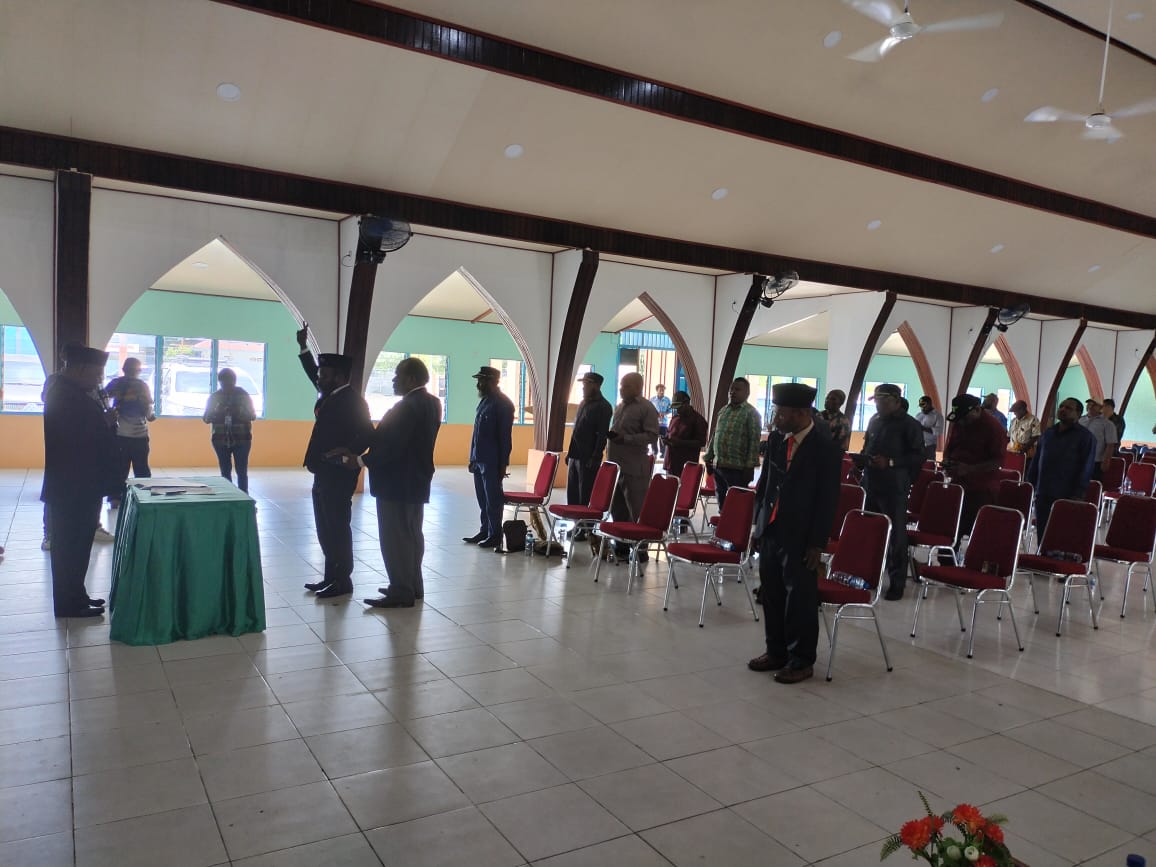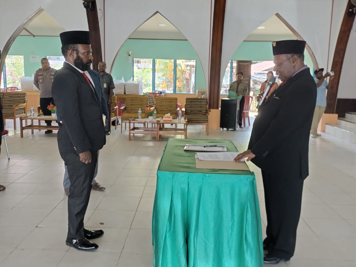 Dogiyai, Rapat Paripurna DPRD Kabupaten Dogiyai dalam rangka Pengucapan Sumpah/Janji Pengganti Antar Waktu (PAW) Wakil Ketua II DPRD Kabupaten Dogiyai periode Tahun 2019 – 2024 yang dilaksanakan di Aula Gereja GKI Maranatha, Senin (06/11/2023).