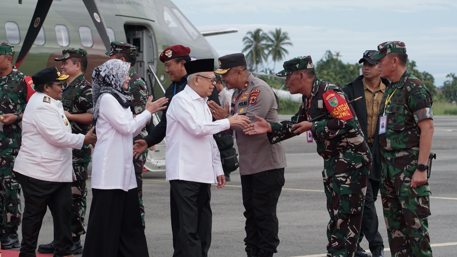 Nabire, Wakil Presiden RI, K.H Ma’ruf Amin, didampingi oleh Ibu Wury Ma’ruf serta diiringi oleh Panglima TNI Laksamana TNI H. Yudho Margono, S.E.,M.M., C.S.F.A, dan Ibu PJ Gubernur Papua Tengah Dr. Ribka Haluk, S.Sos.,MM, tiba di Kabupaten Nabire, Provinsi Papua Tengah, dalam rangka kunjungan kerja.