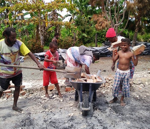 Warga baik orang dewasa maupun anak kecil terlihat bahu membahu membawa sekop dan gerobak serong, sambil mengangkat puing bangunan bekas kebakaran.