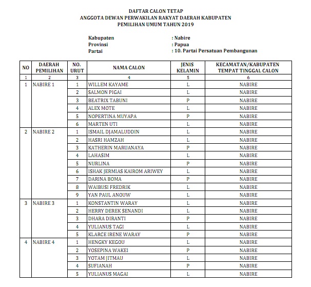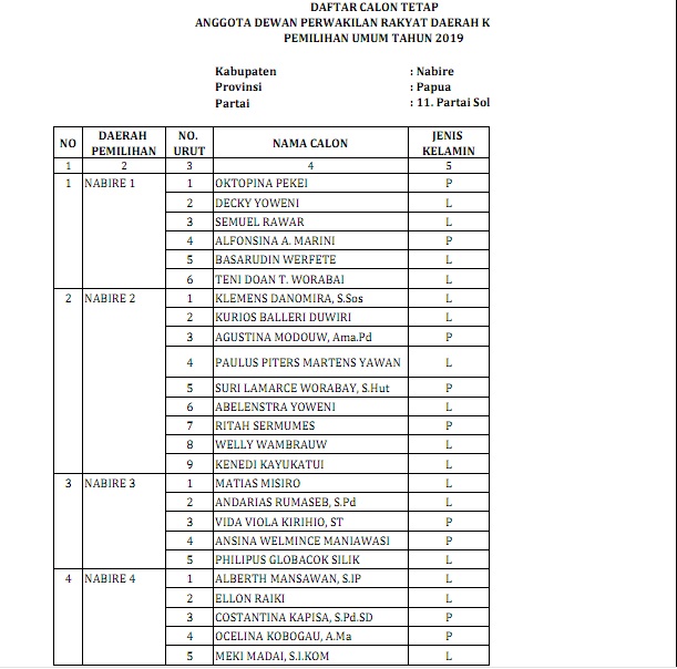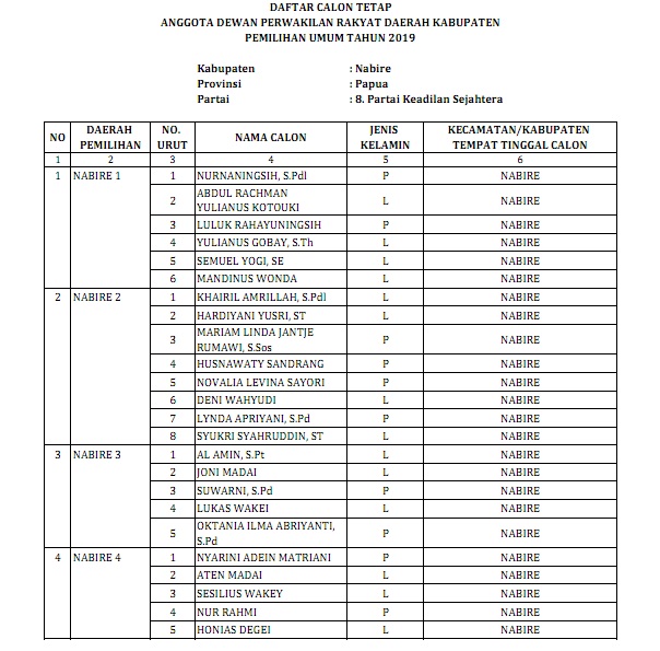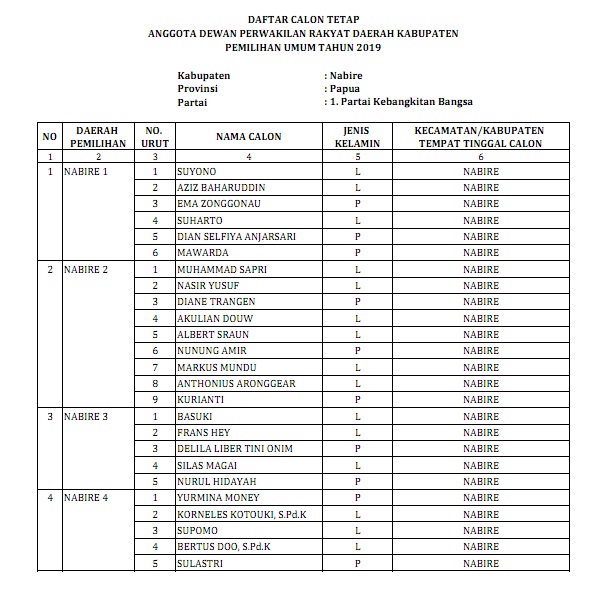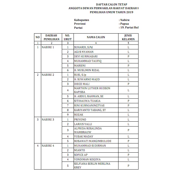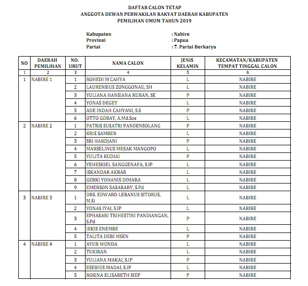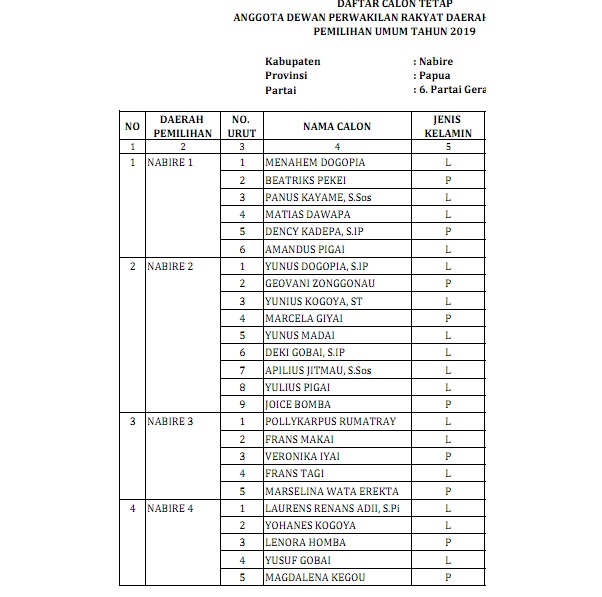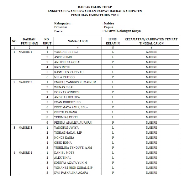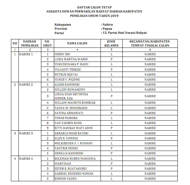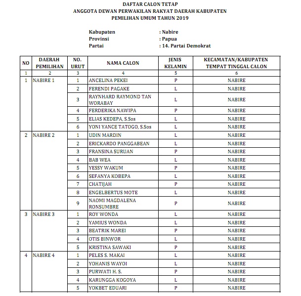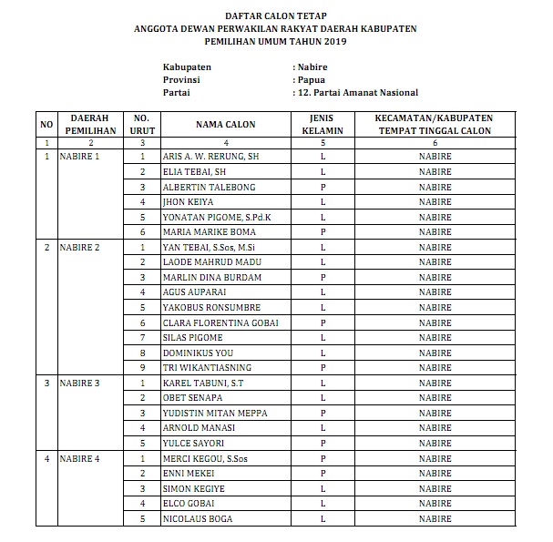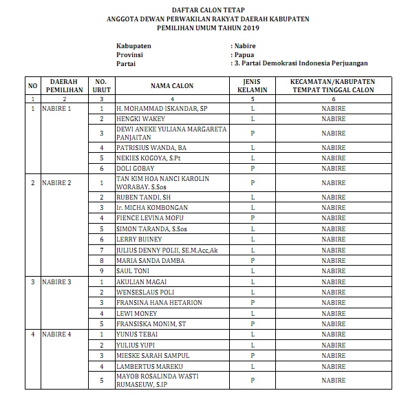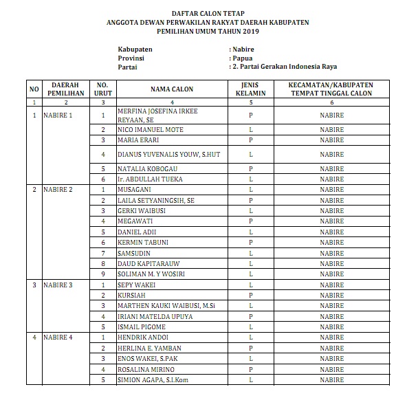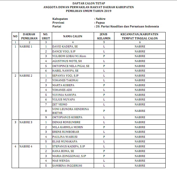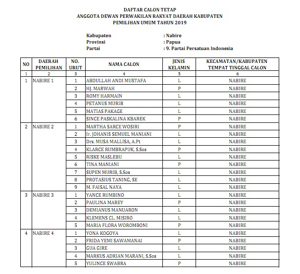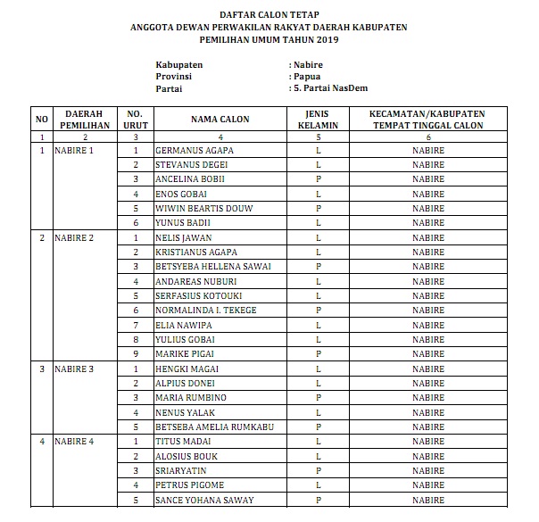 Berikut Daftar Calon Tetap anggota DPRD kabupaten Nabire yang akan bersaing pada Pemilu Legislatif 2019 mendatang :