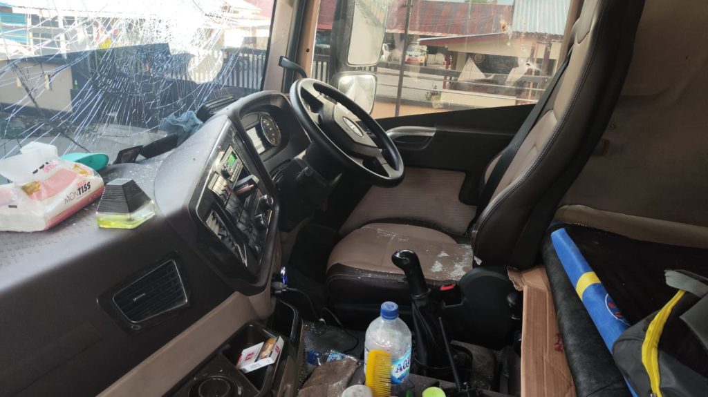 Akibat kejadian itu, kaca truk mengalami kerusakan cukup serius. Meski demikian, sopir berhasil menyelamatkan diri dan keluar dari lokasi dalam keadaan selamat.