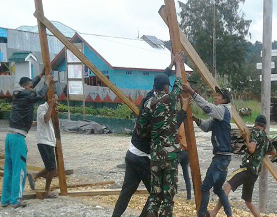 Demi mewujudkan kemanunggalan TNI bersama Rakyat, anggota Koramil Waghete mempererat jalinan hubungan kekeluargaan dengan menyelenggarakan kegiatan Gotong Royong membantu pembuatan rumah Bapak Wagimin di Distrik Kamuu Kabupaten Deiyai, Minggu (08/01).