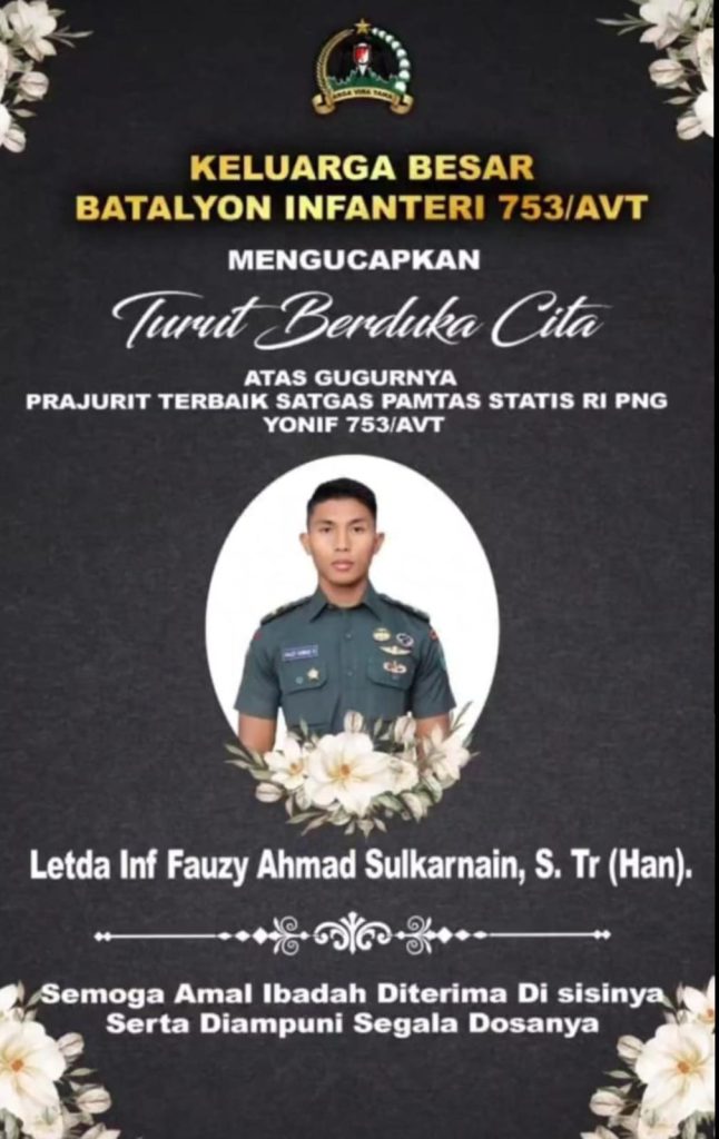 Nabire, 11 Oktober 2025, Satu anggota Satgas Pamtas dari Yonif 753/AVT, dikabarkan gugur tertembak di Kiwirok, Pegunungan Bintang, Papua Pegunungan, Sabtu (11/10).