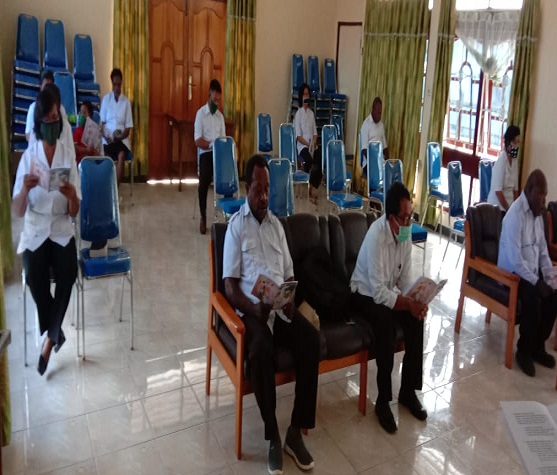Hal tersebut sesuai dengan aturan pemerintah daerah dan juga arahan Kepala Kantor Kemenag Nabire, Yafeth Iyai, S.Th, agar semua ASN di lingkungan Kemenag Nabire mematuhi protokol kesehatan seperti wajib menggunakan masker, wajib cuci tangan, jaga jarak, dan lain sebagainya.