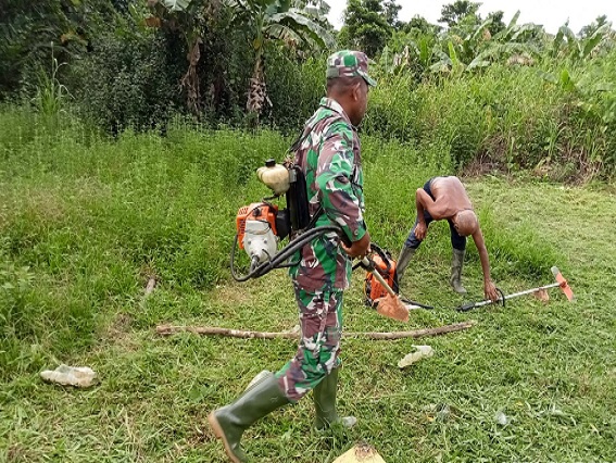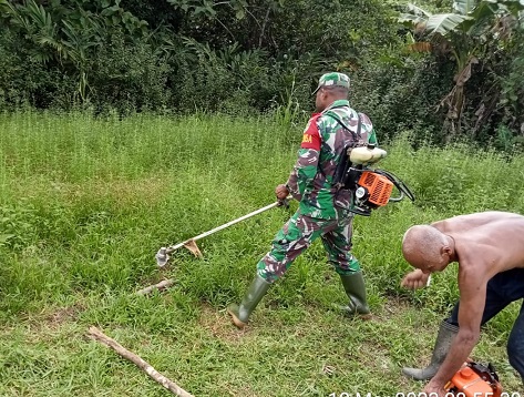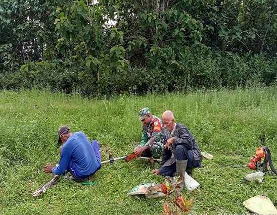 Nabire, Babinsa Koramil 1705-02/Napan, membantu warga membersihkan Makam di Kampung Wami, Distrik Yaur, kabupaten Nabire, Papua Tengah, Selasa (28/03/2023).