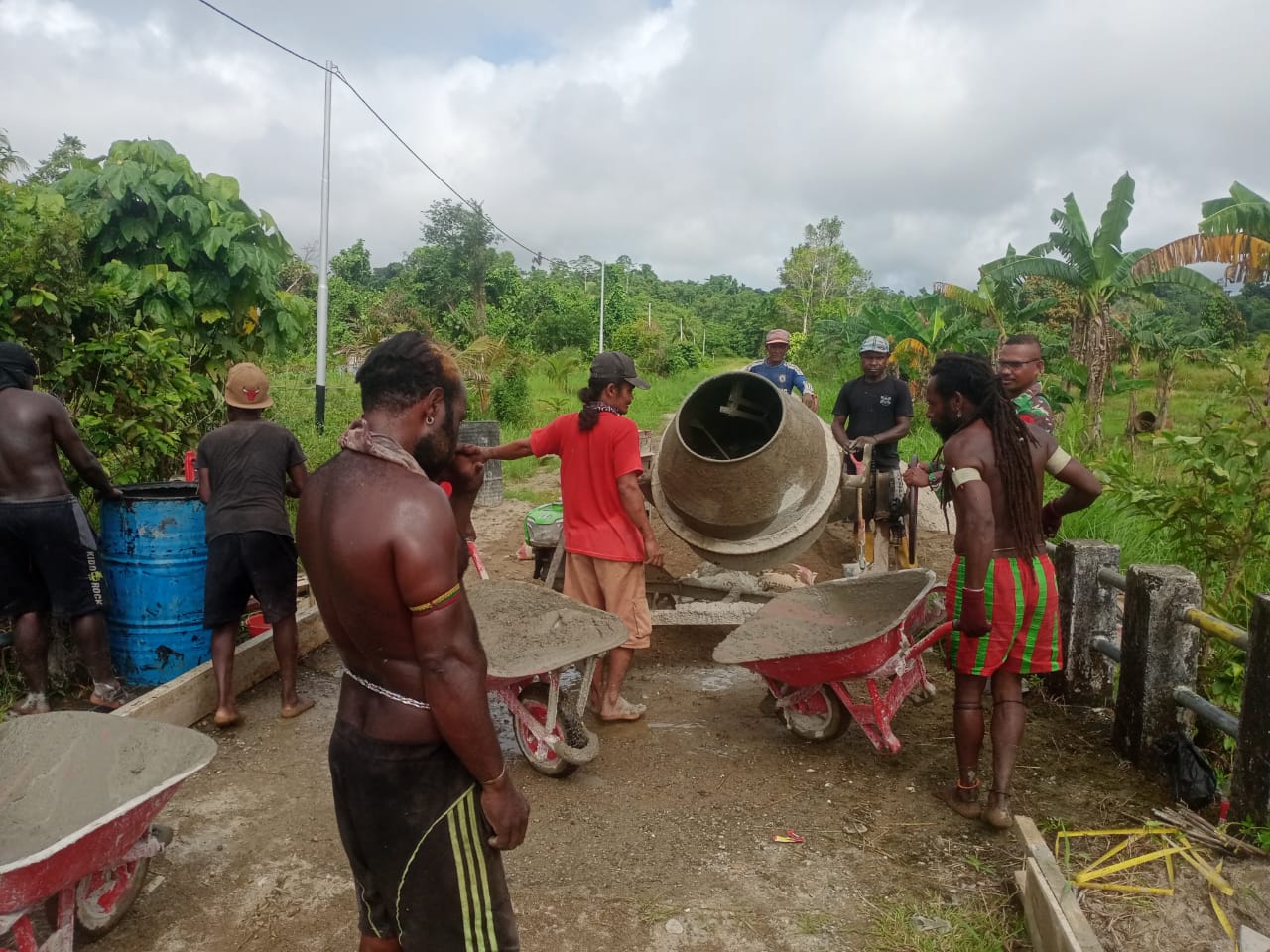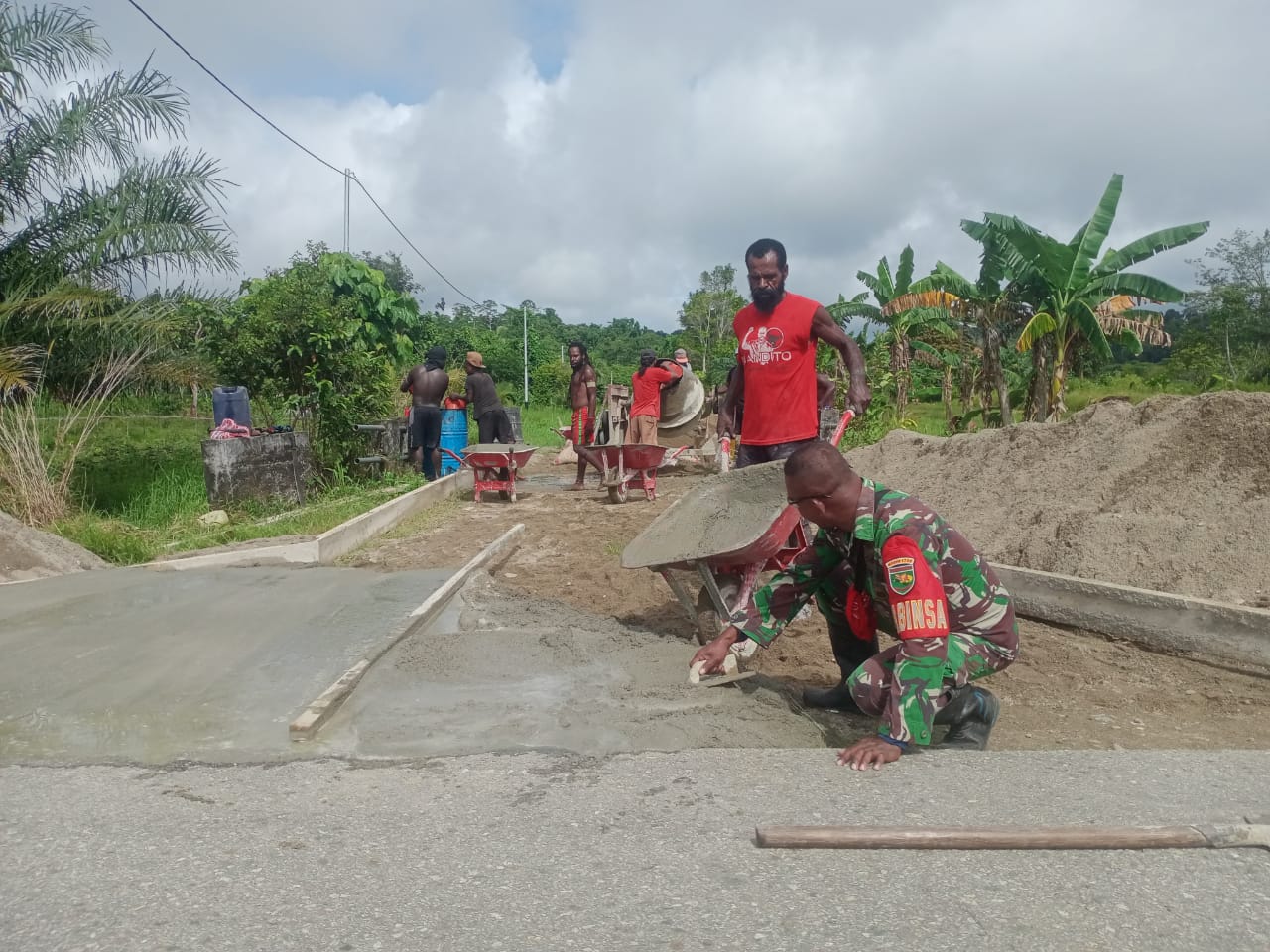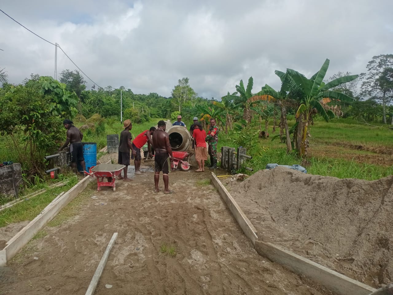 Babinsa Koramil 1705-03/Kwatisore Bantu Pengecoran Jalan di Kampung Wami, Warga Antusias Gotong Royong