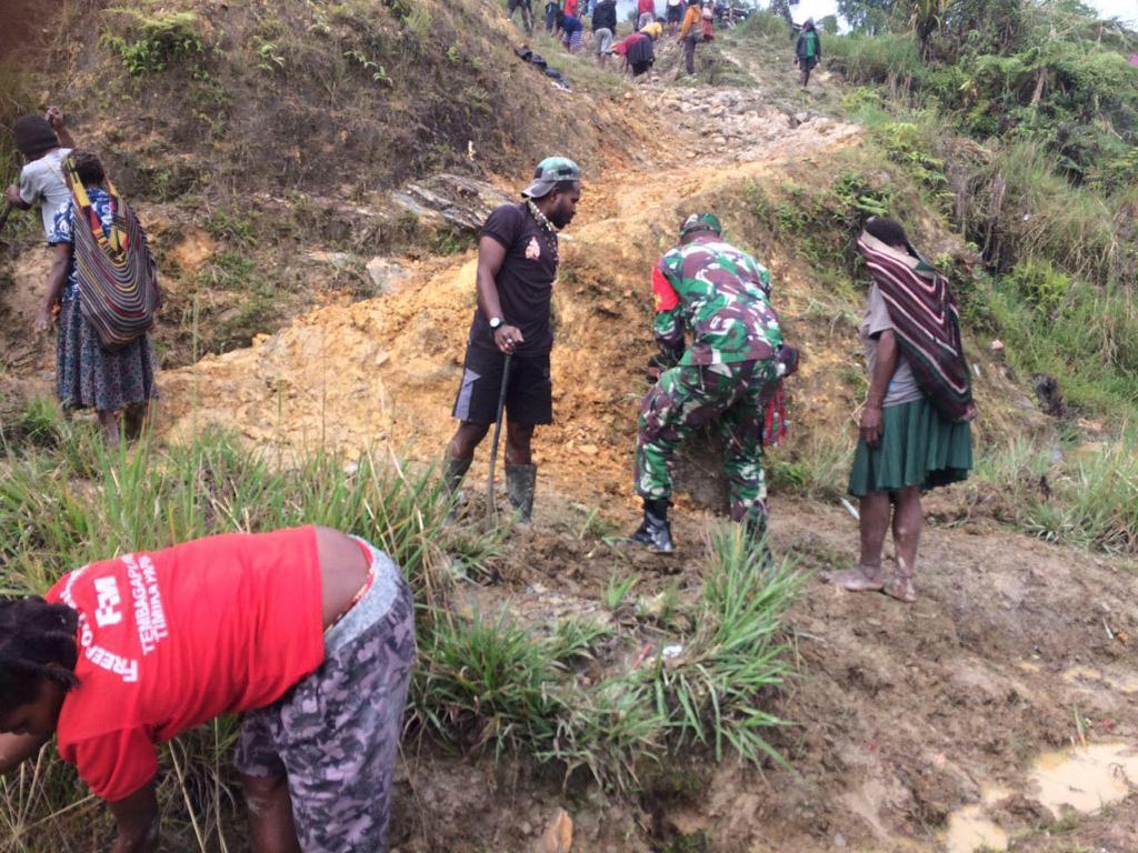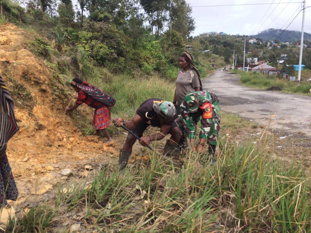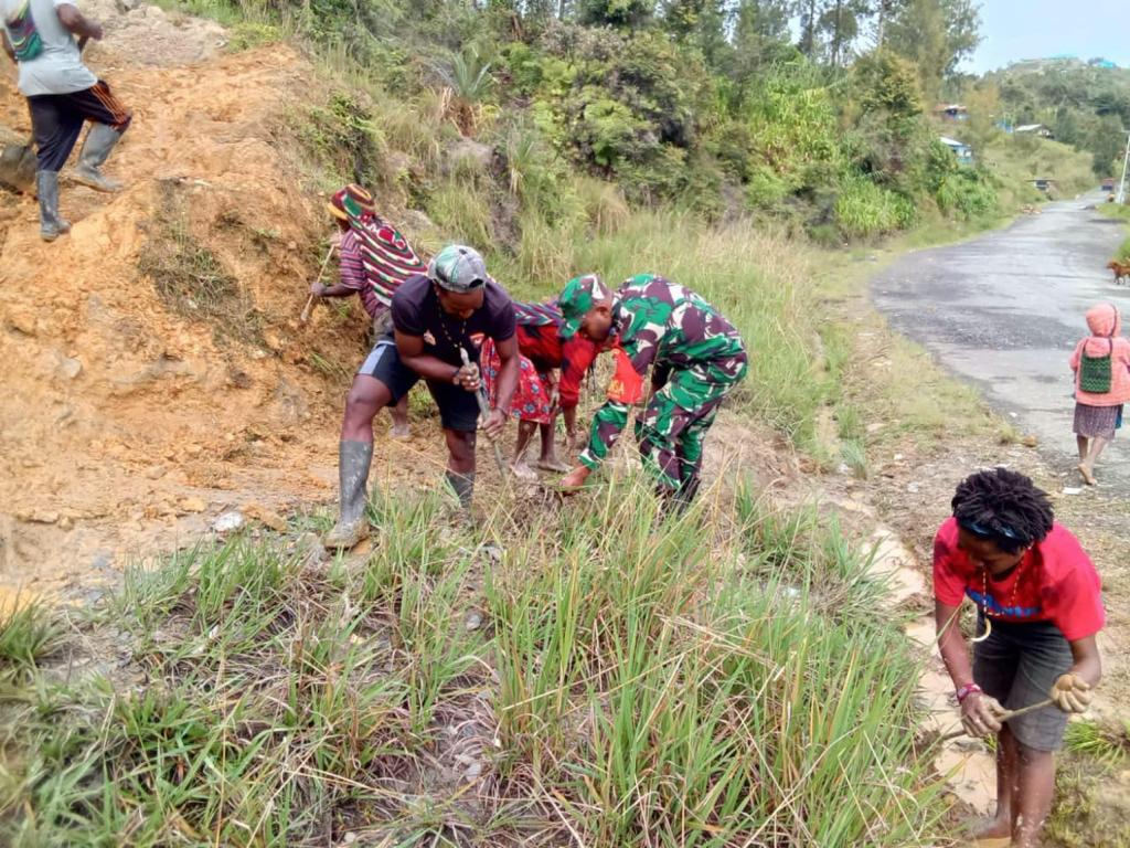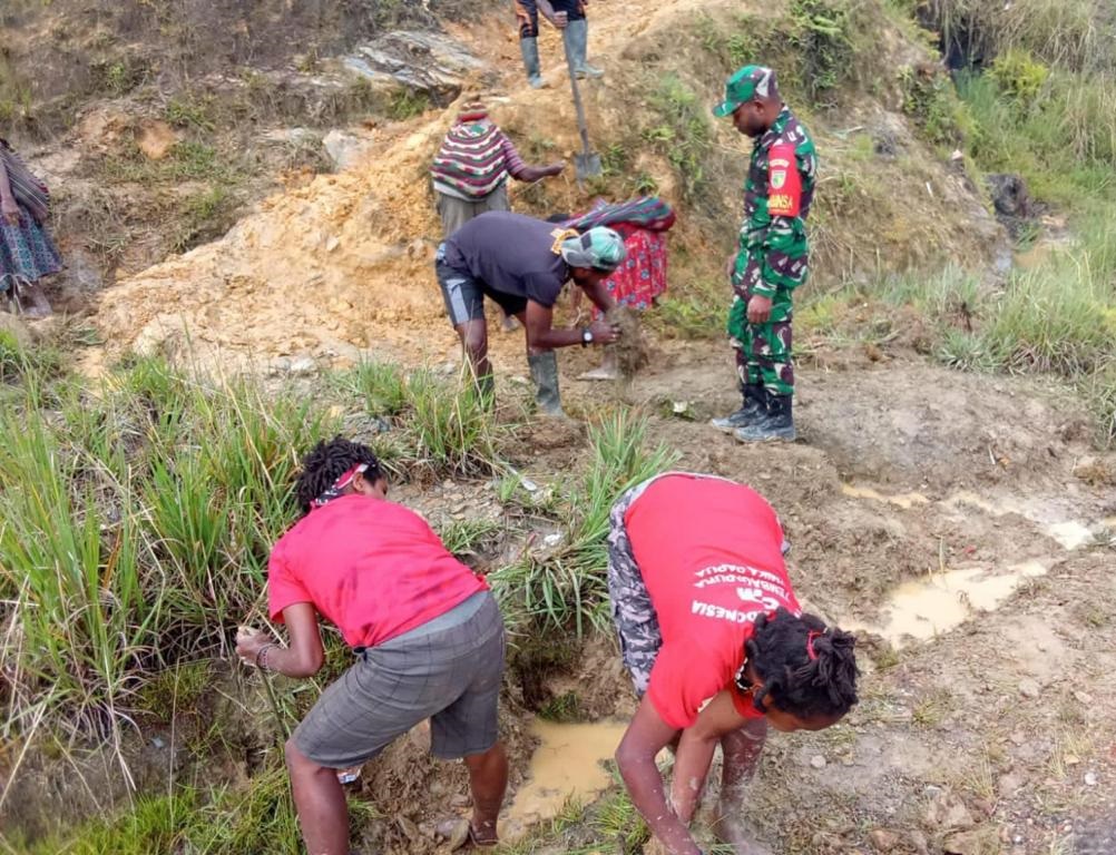 Intan Jaya, Sebagai bentuk kepedulian Babinsa terhadap kendala di wilayahnya, Babinsa Koramil 1705-08/Sugapa, Pratu Yusup Fenetruma, melaksanakan karya bakti bersama sama masyarakat memperbaiki jalan setapak yang menuju kampung binaanya di Distrik Sugapa, Kabupaten Intan Jaya, Provinsi Papua Tengah, Selasa (16/01/2024).