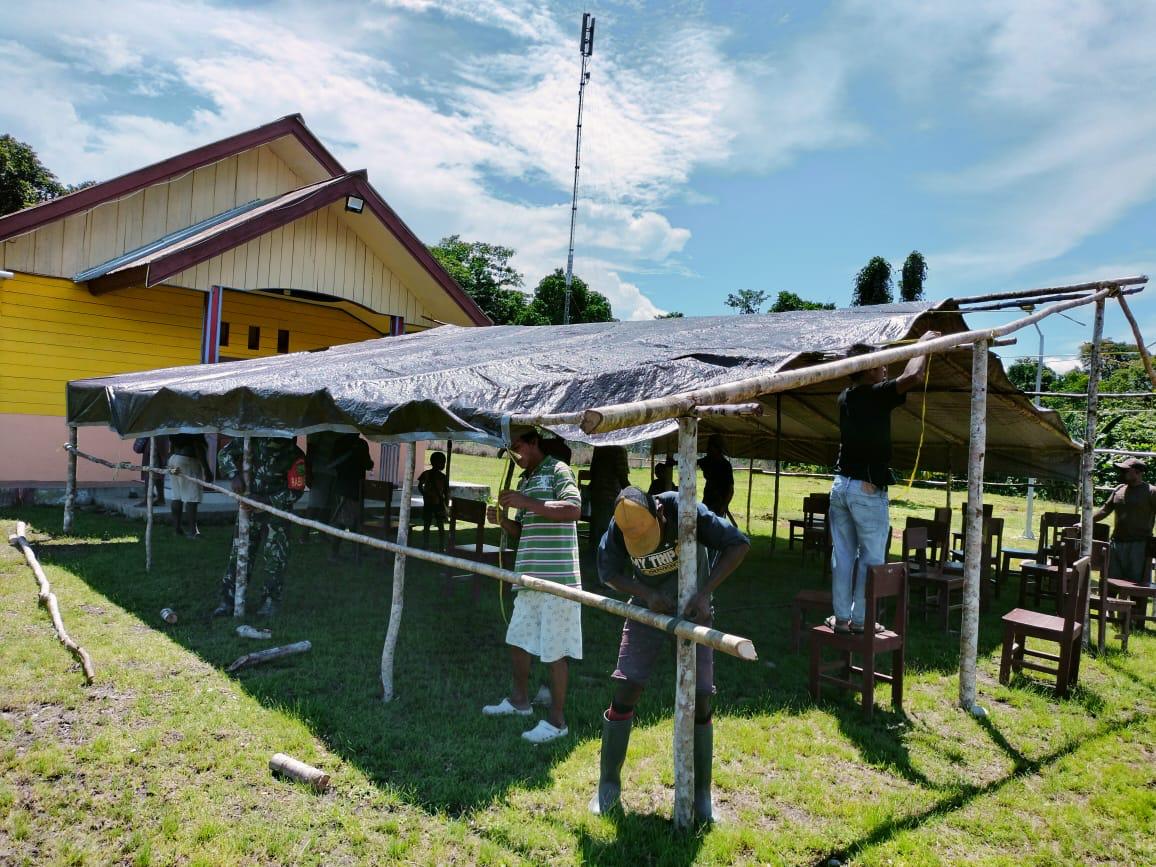 Nabire, Babinsa Koramil 1705-07/Siriwo, Serka Fransiskus Mithen dan Serda Ridolof Leatemia, bersama-sama dengan warga mendirikan tenda untuk ibadah gabungan HUT Pekabaran Injil (PI) di Tanah Papua ke-169, yang jatuh pada tanggal 5 Februari 2024.