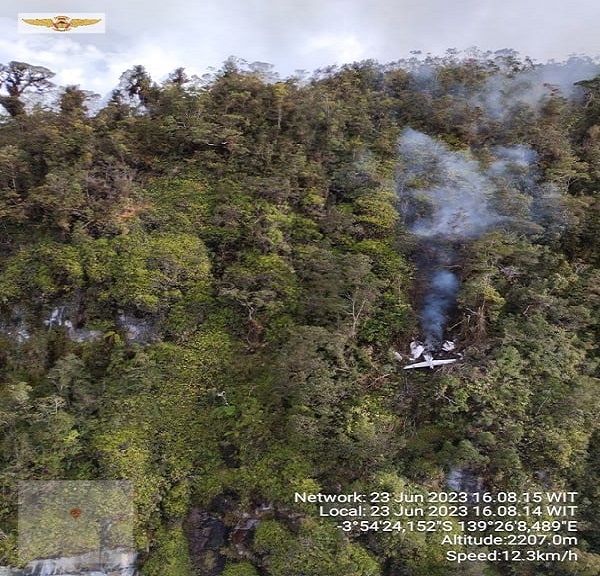 Jayapura, Bangkai Pesawat SAM Air PK-SMW yang mengalami hilang kontak pada koordinat 4°02’46.32″S 139°21’28.20″ E, Jumat (23/06/2023), ditemukan.
