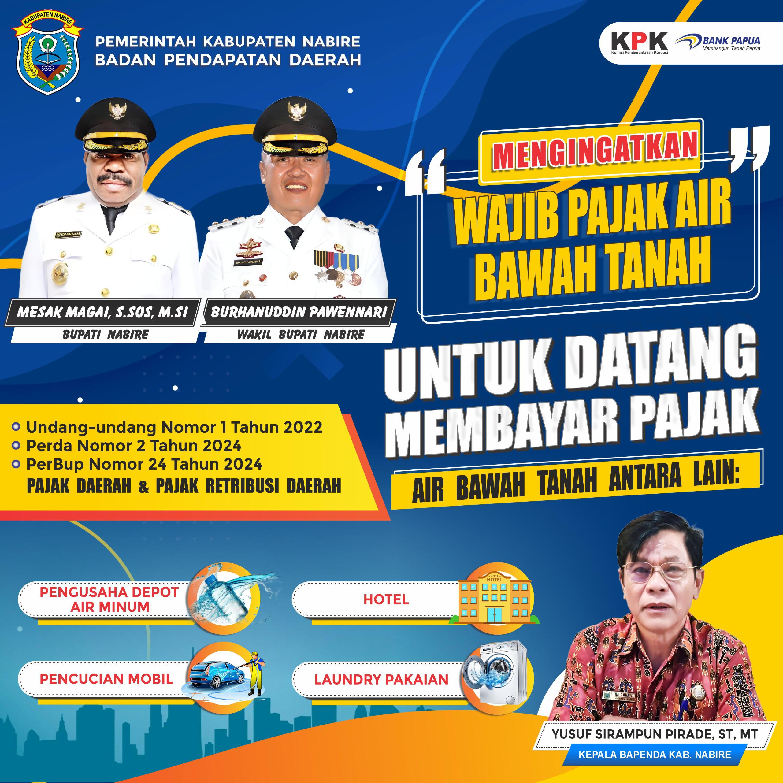 Kepala Bapenda Kabupaten Nabire, Yusuf Sirampun Pirade, ST., MT., menegaskan bahwa pembayaran pajak air bawah tanah adalah kewajiban bagi para pelaku usaha yang mengambil dan memanfaatkan sumber daya alam tersebut. Hal ini bertujuan untuk mendukung pembangunan daerah yang berkelanjutan dan memastikan pemanfaatan sumber daya air secara adil dan bertanggung jawab.