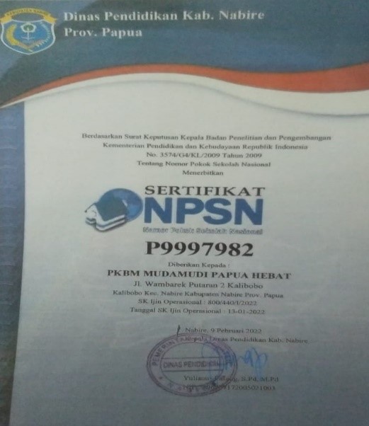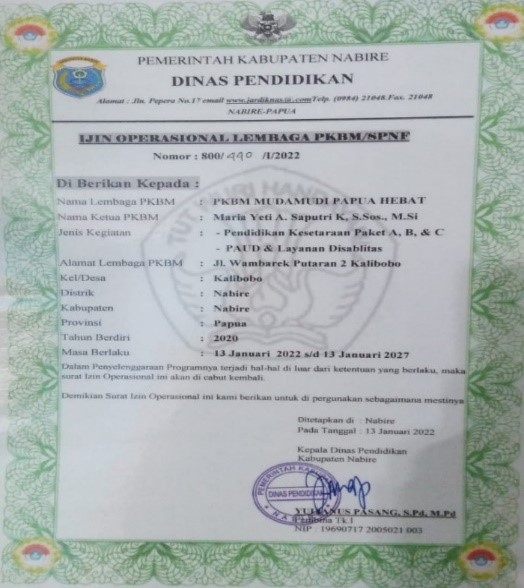Kegiatan PKBM dimulai tahu 2022 dengan mengusung PENDIDIKAN GRATIS UNTUK PAPUA usia dasar untuk usia sekolah. Paket A, B, C dimulai dengan diampu oleh para pendidikan yang berpengalaman. Mereka berjuang untuk pendidikan Papua khususnya Nabire tanpa lelah, ihklas dan tanpa mengenal waktu, sebagai gambaran kegiatan PKBM ini telah diakui dan sudah terdaftar di Departemen Pendidikan melalui Dinas Penididkan Kabupaten Nabire. Ini dibuktikan dengan setifikan NPSN dan Ijin Operasional dari Dinas Pendidikan Kabupaten Nabire Papua.