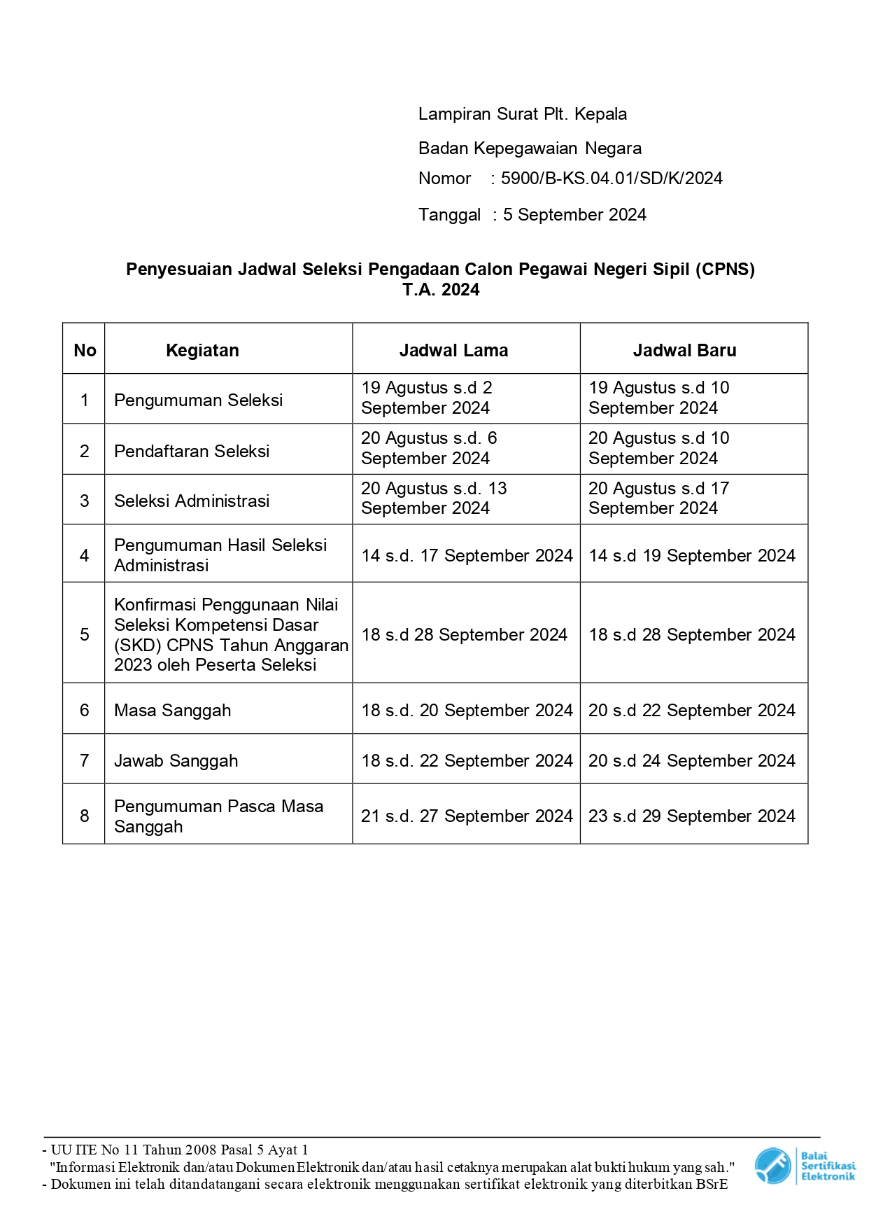 Berikut lampiran penyesuaian jadwal CPNS Tahun 2024 :