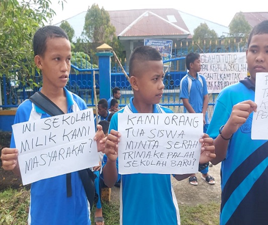 Nabire, Sejumlah orang tua wali murid melakukan aksi pemalangan SMP Negeri 7 Nabire, dan meminta agar jabatan Kepala Sekolah yang baru segera diserahterimakan.