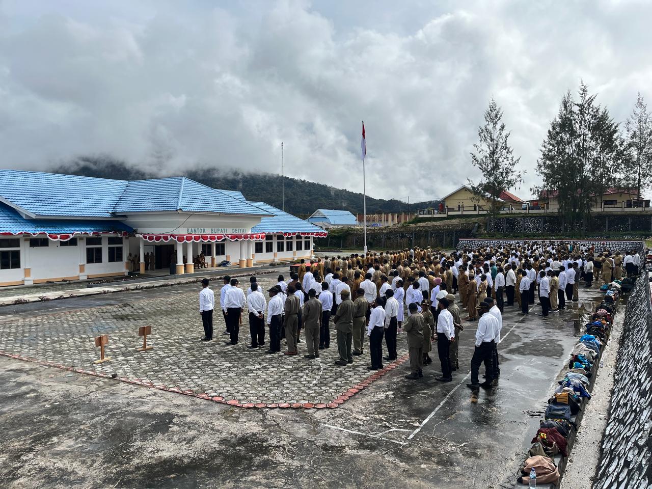Deiyai, 8 September 2025 – Bupati Deiyai, Melkianus Mote, S.T, memimpin apel gabungan Aparatur Sipil Negara (ASN) dan tenaga kontrak dari seluruh Organisasi Perangkat Daerah (OPD) di halaman Kantor Bupati Deiyai, Senin (08/09).